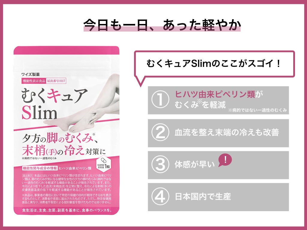 胡椒の一種で血流を良くするスパイスとして知られる「ヒハツ」を主成分にした「むくキュアSlim」は、脚のむくみ、手の冷えの対策サプリメントです。やるべきことがたくさんあって忙しい現代女性でも、いつでもどこでも飲みやすいように持ち運びに便利な粒タイプです。「むくキュアSlim」は、ストレスの多い環境でいつも頑張っている女性の負荷軽減をサポートします。