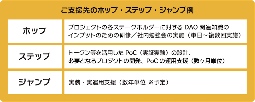 DAOの仕組みを活用した取り組みのホップ・ステップ・ジャンプ、それぞれのフェーズをご支援したいという思いを込めて、DAOを3段階に重ねた「DAODAODAO」という名称としております。