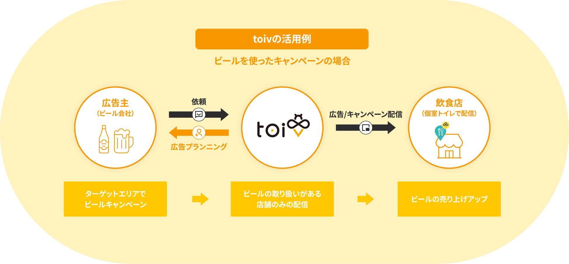 子供の頃から通っていた街の中華食堂が、新型コロナの影響により、22 年の歴史に幕を閉じました。同じようなお店を増やしたくない、飲食店様に貢献できることはないか、そんな思いがきっかけとなり、個室トイレに小型のデジタルサイネージを設置するだけで定期的な副収入を提供する、個室トイレ内動画広告『トイビー』を企画・開発しました。2022年11月より、恵比寿・渋谷・銀座エリア150店舗をモニターとして、『トイビー』テスト配信を開始、本テスト配信の結果に基づき、2022年12月より恵比寿・中目黒・渋谷・銀座・新橋・新宿エリアでさらなる拡大を予定しております。