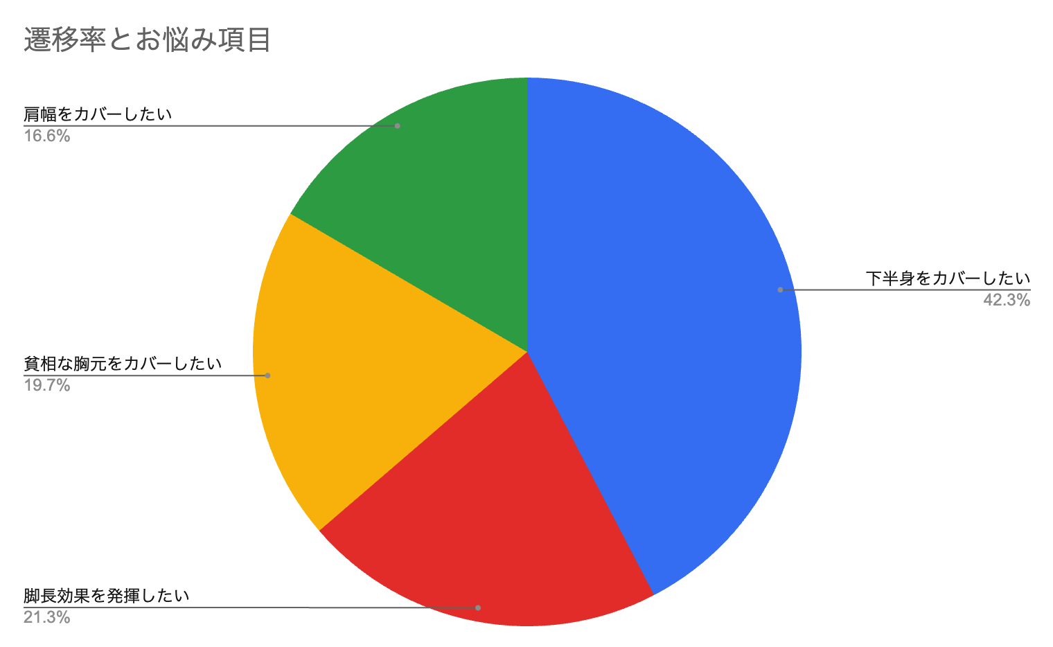 「下半身をカバーしたい」を選択しているユーザーが圧倒的に多く(Ss数:8108)、その次に、「脚長効果を発揮したい」(Ss数:4088)、3番目に「貧相な胸元をカバーしたい」(Ss数:3776)、4番目に「肩幅をカバーしたい」(Ss数:3176)という順位でした。特に上半身よりも下半身に問題意識を抱えている方は多いようです。