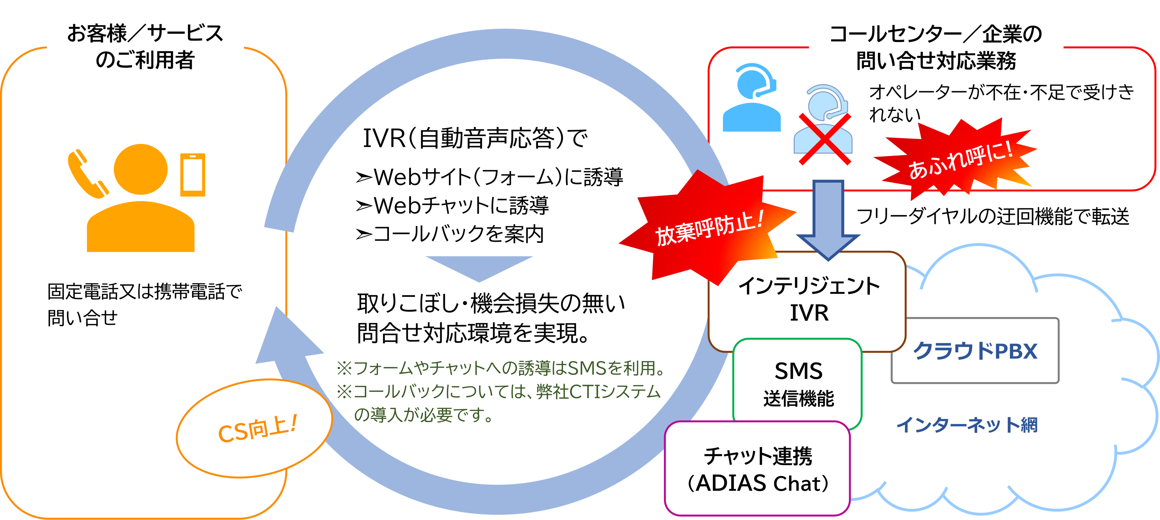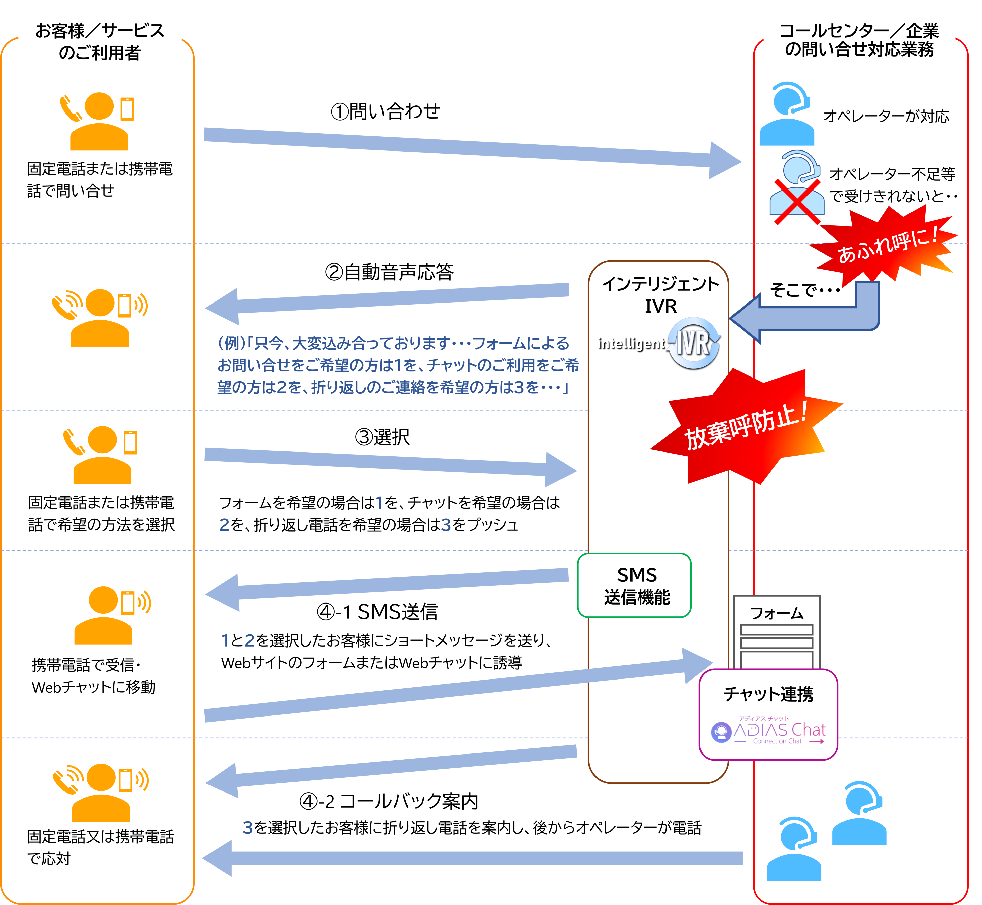 「放棄呼」とは、コールセンター等の問合せ対応業務で、オペレーター不足等の理由により、オペレーターが対応する前に切断されてしまったコールのことを指し、顧客の不満や機会損失に直結する為、その数(放棄呼数)はコールセンターの運営において重要な指標の一つとされています。また、オペレーターに繋がらず放棄呼になる前に待たされた状態にあるコールは「あふれ呼(待ち呼)」と呼ばれます。今回、リリースされたインテリジェントIVRは、オペレーターの不在又は不足により問い合せコールが「あふれ呼」になる段階で、IVR(自動音声応答)からWebサイト(フォーム)の利用やWebチャットの利用、折り返し電話を案内し(この際、リンク先URLはSMS送信で通知)、相手先に別の連絡方法の選択を促すことで、「あふれ呼」の状態にある問い合せが「放棄呼」になるのを防ぎます。
