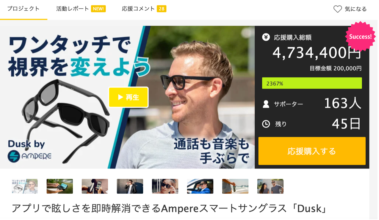 【目標金額2367%突破!】Makuake(マクアケ)にて「アプリで眩しさを即時解消できるAmpere Duskスマートサングラス」