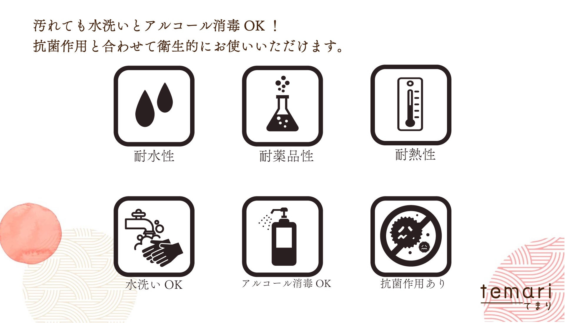 ●耐水性、耐薬品性、耐熱性に優れた素材で水洗いとアルコール消毒ができます!さらに抗菌作用もあるので安心してお使いいただけます。