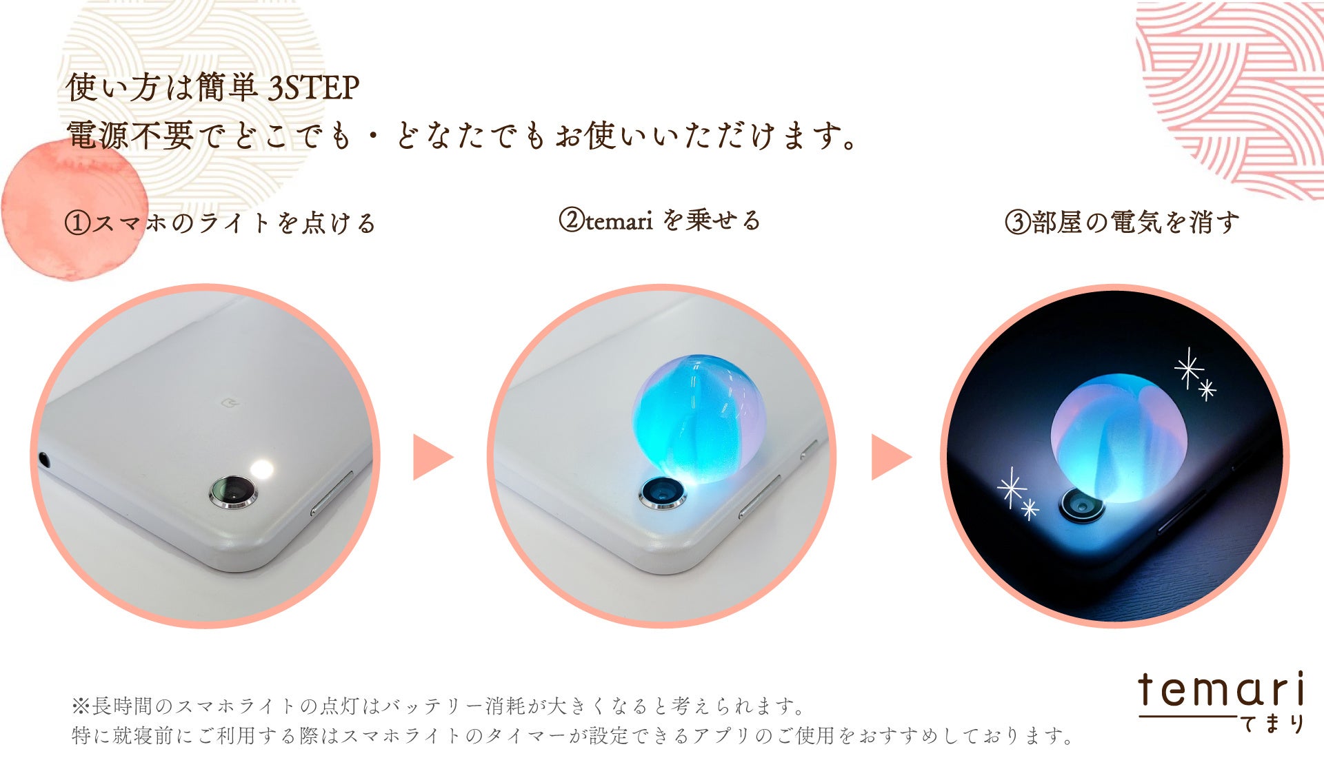 ①ライトを点ける②temariを乗せる③部屋を暗くする 簡単3stepで綺麗な光を感じる癒しの時間をお届け