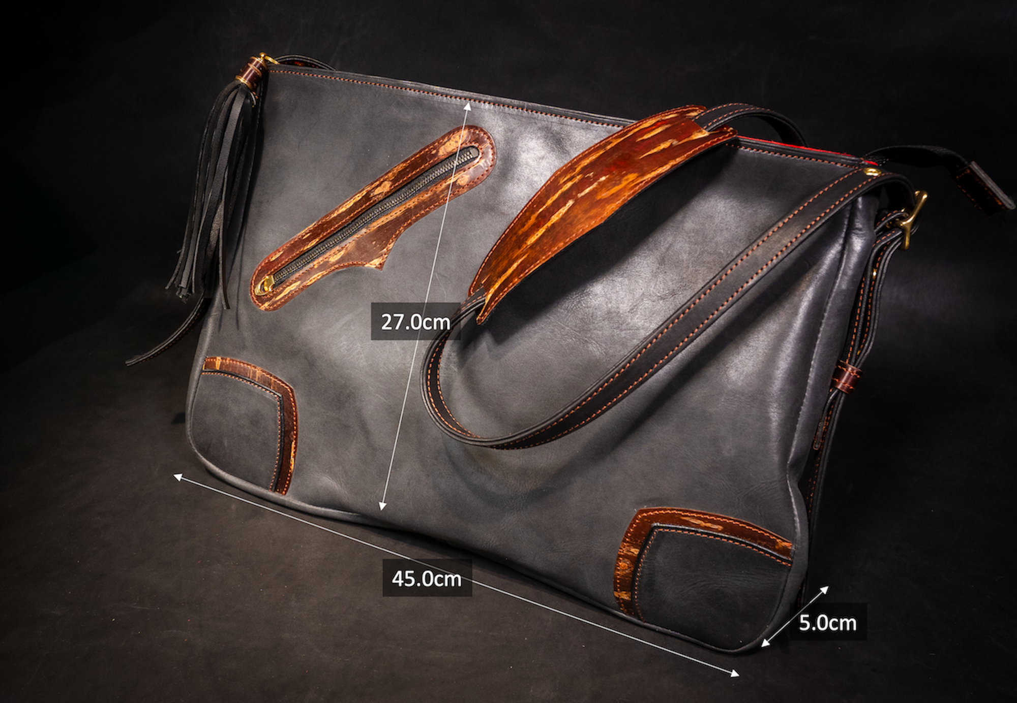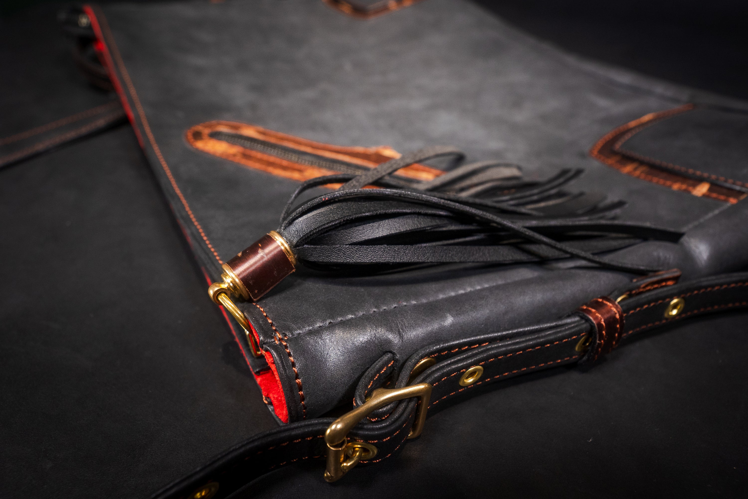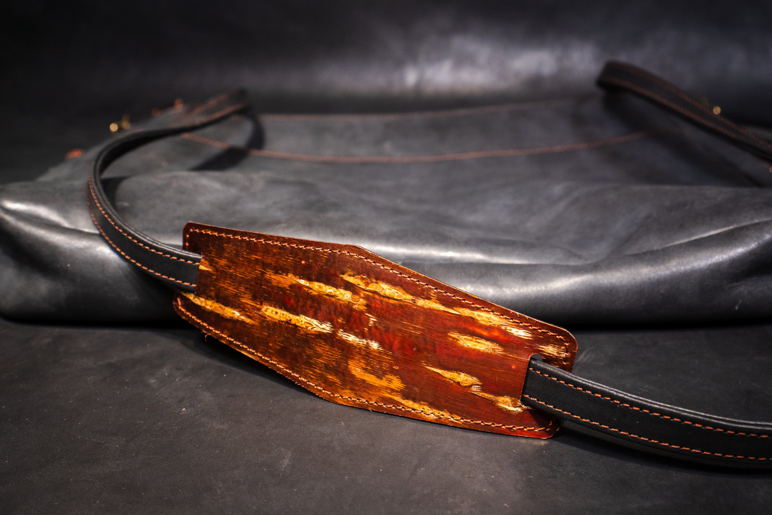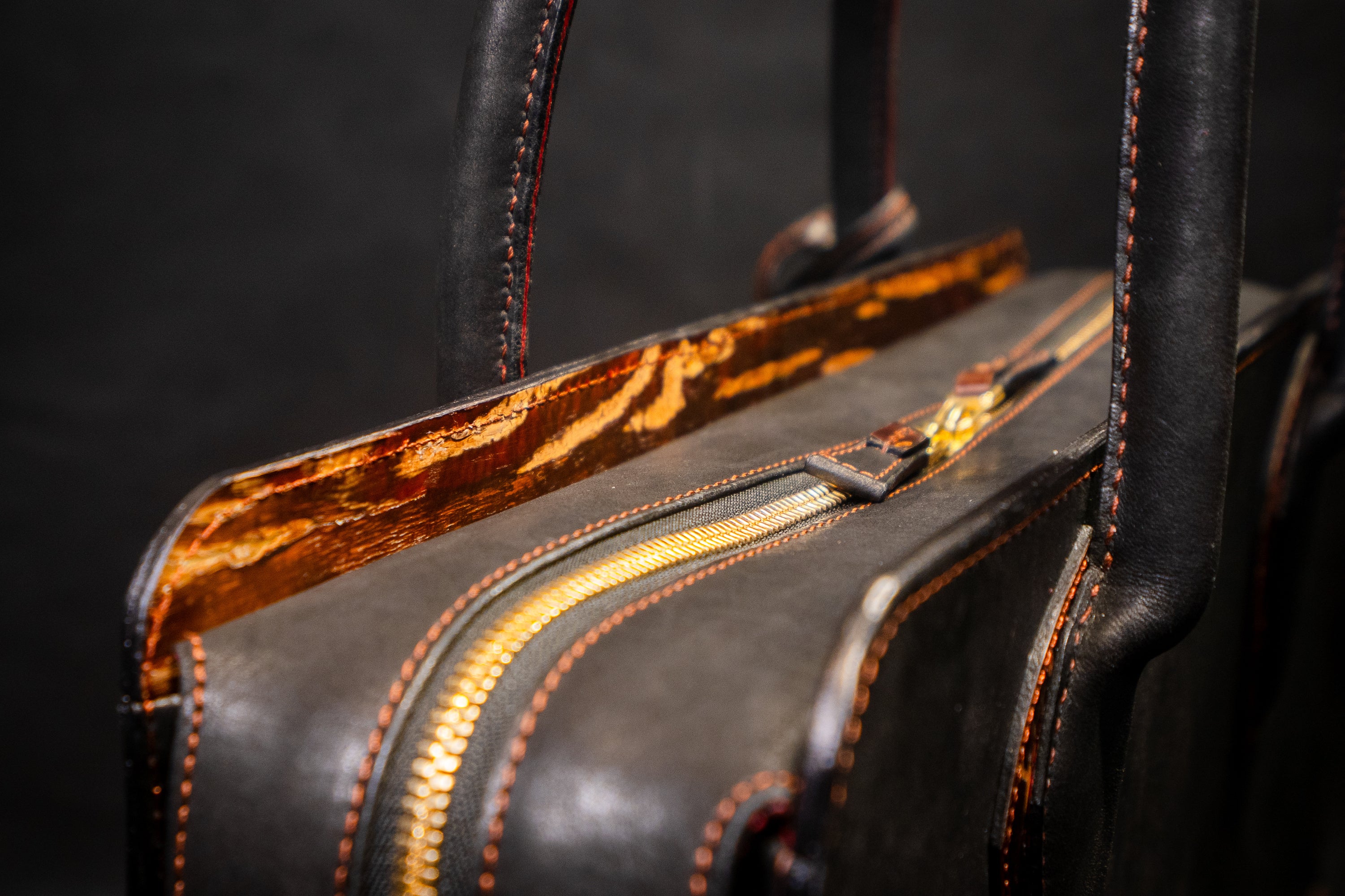 樺細工を使うにあたり、こだわったのは樺の色艶を立たせる革の「黒」。日本国内有数の皮革産地である姫路に赴き、無数にある素材の中から最も「革×樺バッグ」に相応しい革を選定しました。雨風に曝され、大荷物の荷重にも耐える撥水性と強靭性を必須として、手にしてから十年以上の付き合いにもなり得る革に求められるのは、持ち主を飽きさせないエイジング(経年変化)。