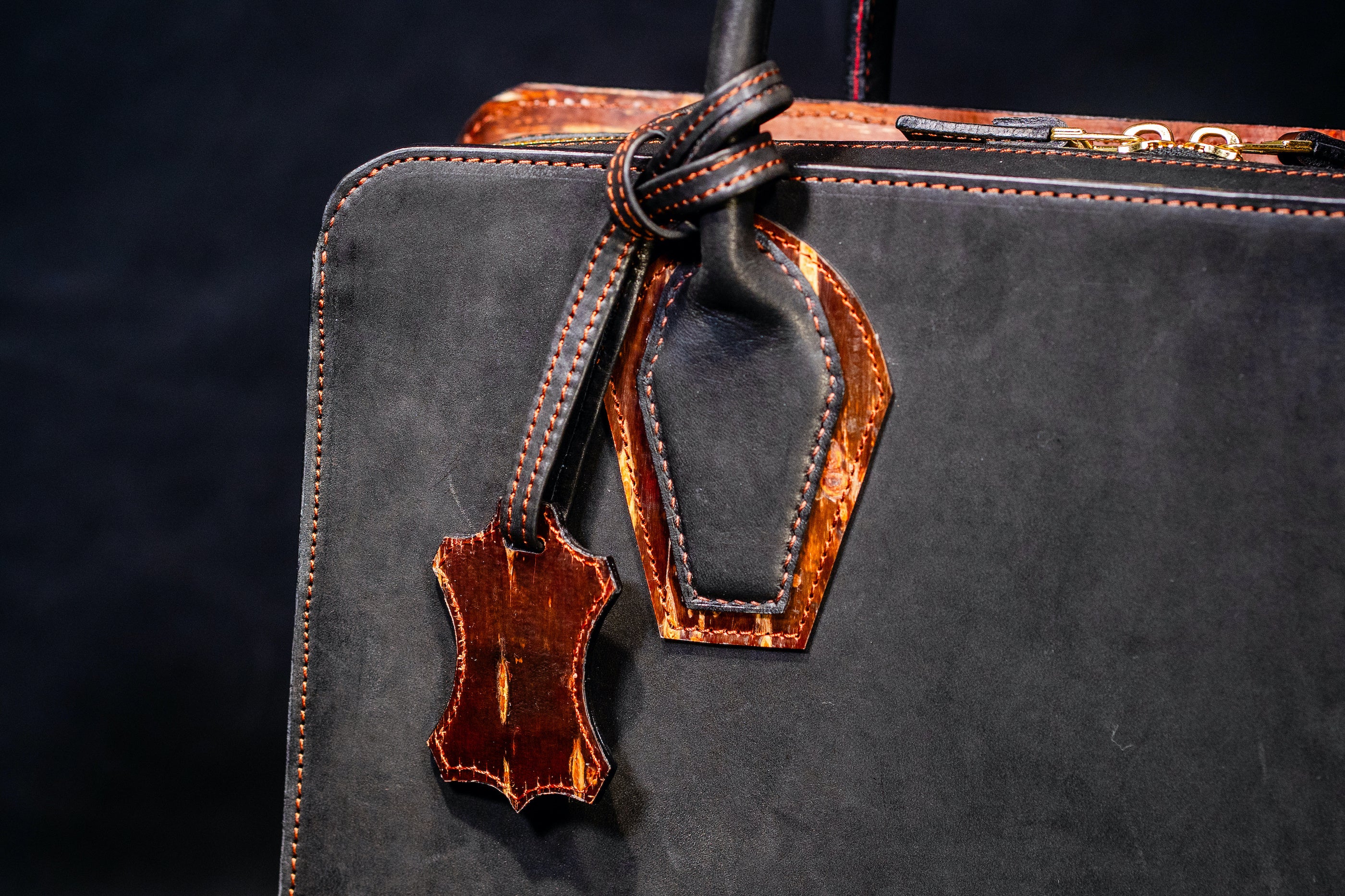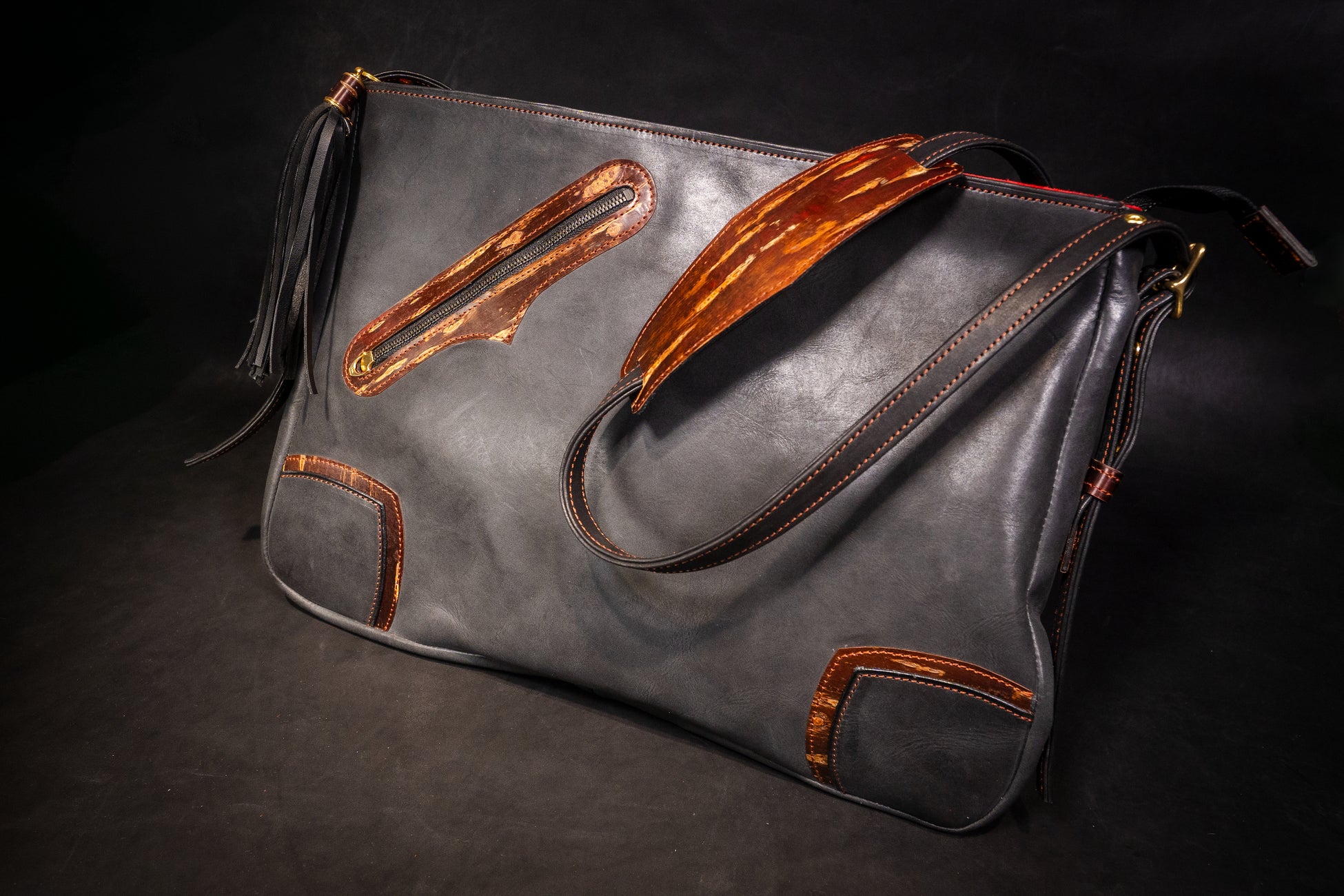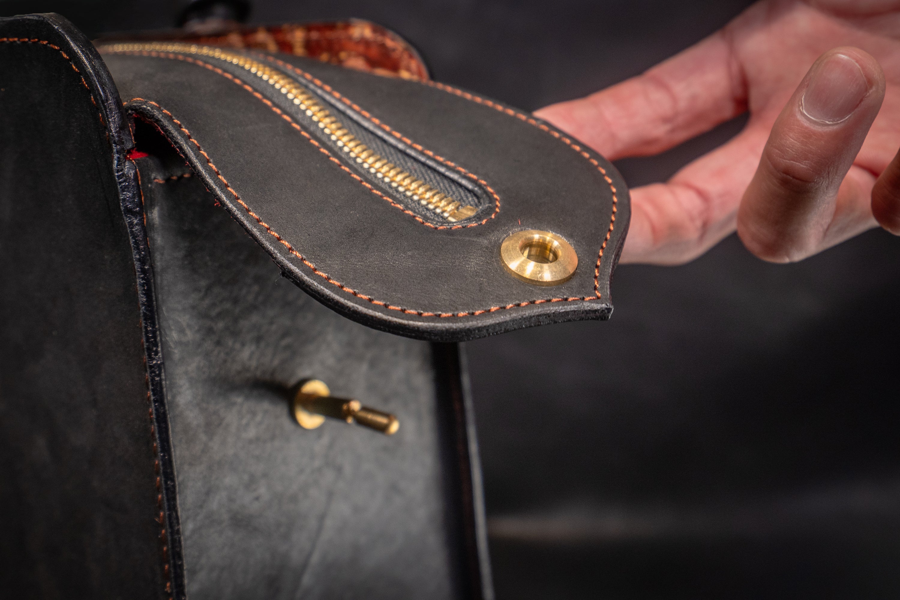 樺細工を使うにあたり、こだわったのは樺の色艶を立たせる革の「黒」。日本国内有数の皮革産地である姫路に赴き、無数にある素材の中から最も「革×樺バッグ」に相応しい革を選定しました。雨風に曝され、大荷物の荷重にも耐える撥水性と強靭性を必須として、手にしてから十年以上の付き合いにもなり得る革に求められるのは、持ち主を飽きさせないエイジング(経年変化)。