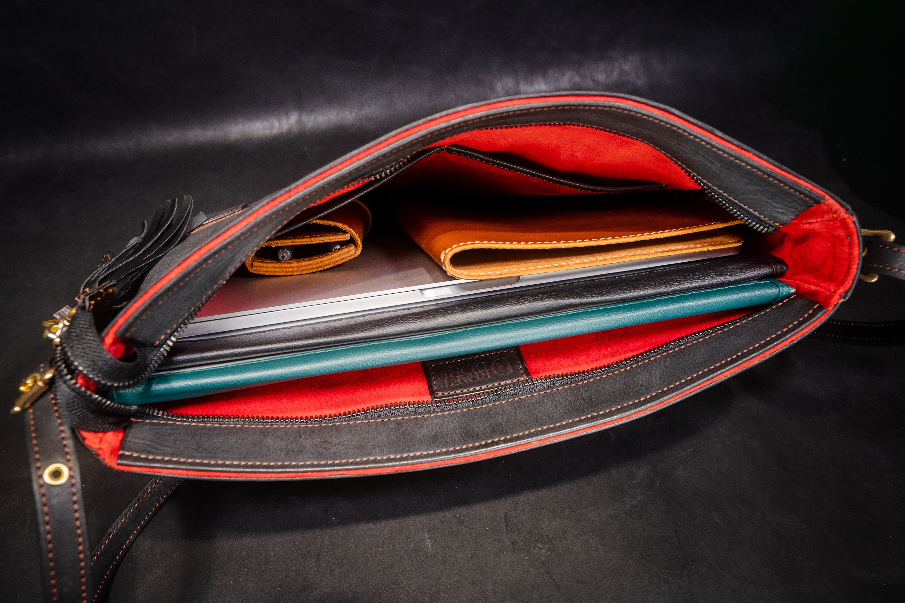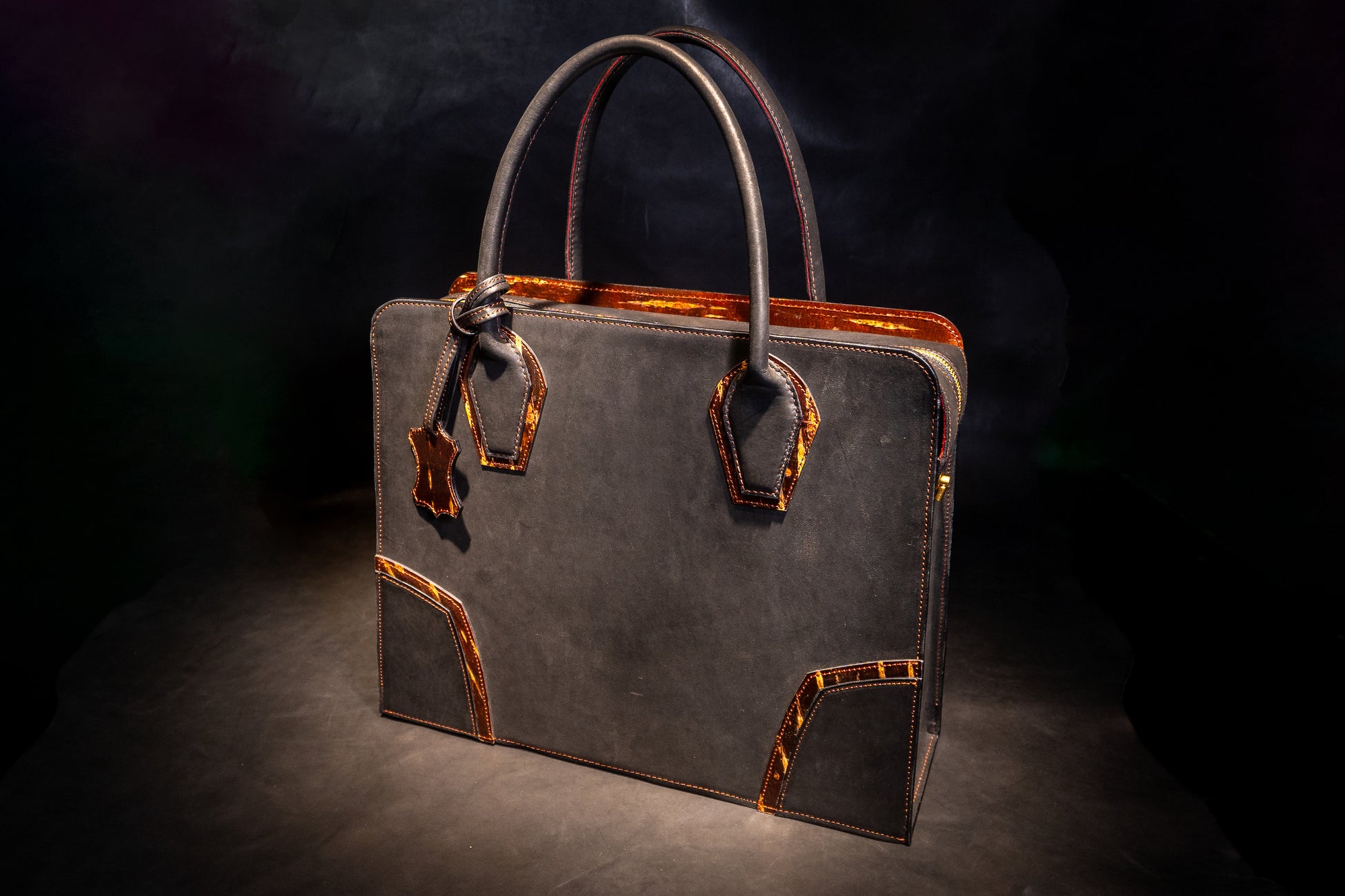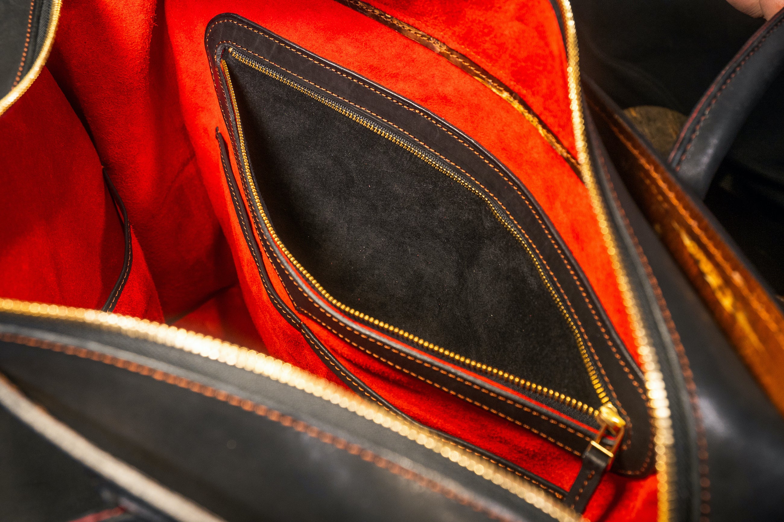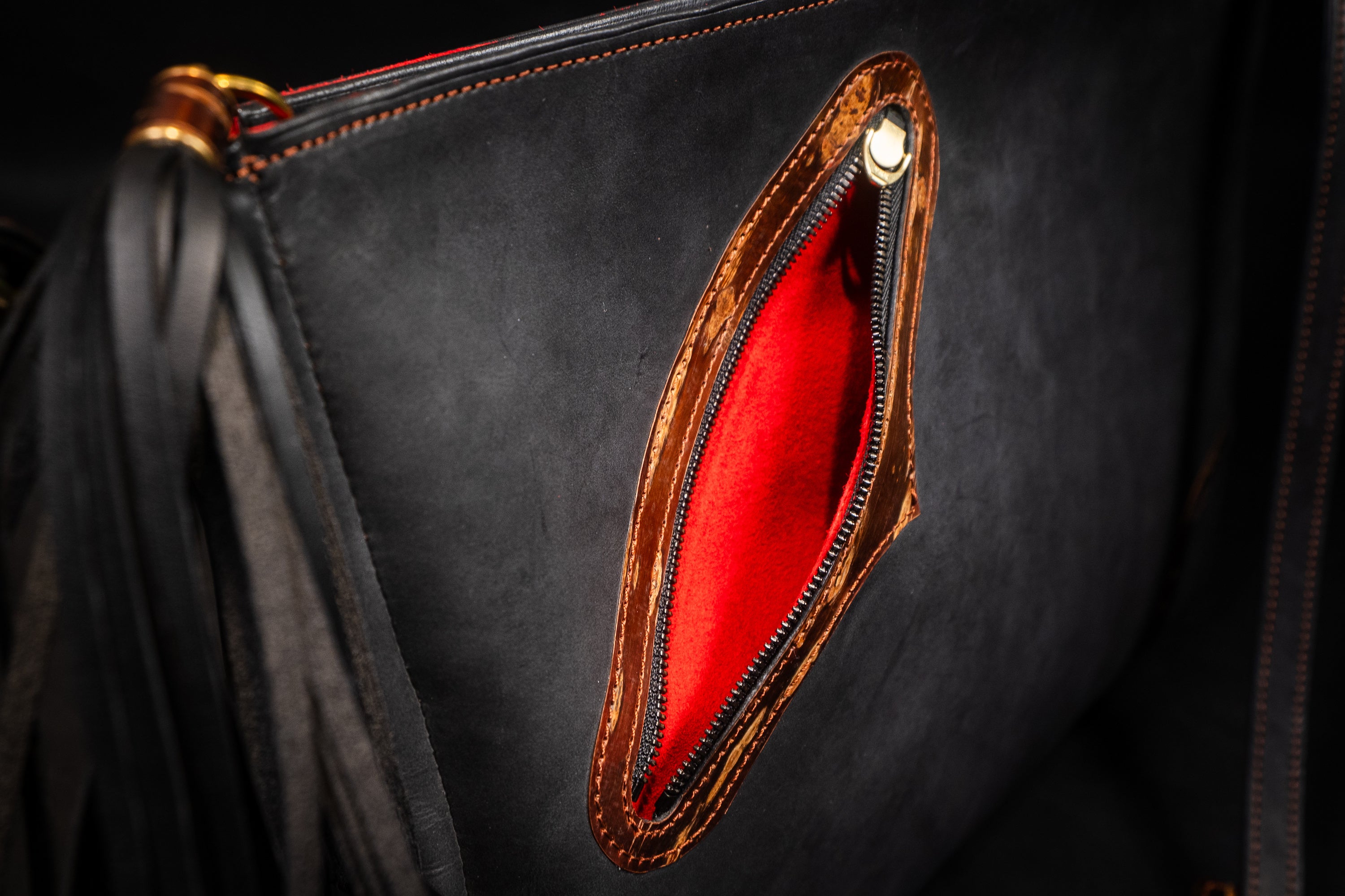樺細工を使うにあたり、こだわったのは樺の色艶を立たせる革の「黒」。日本国内有数の皮革産地である姫路に赴き、無数にある素材の中から最も「革×樺バッグ」に相応しい革を選定しました。雨風に曝され、大荷物の荷重にも耐える撥水性と強靭性を必須として、手にしてから十年以上の付き合いにもなり得る革に求められるのは、持ち主を飽きさせないエイジング(経年変化)。