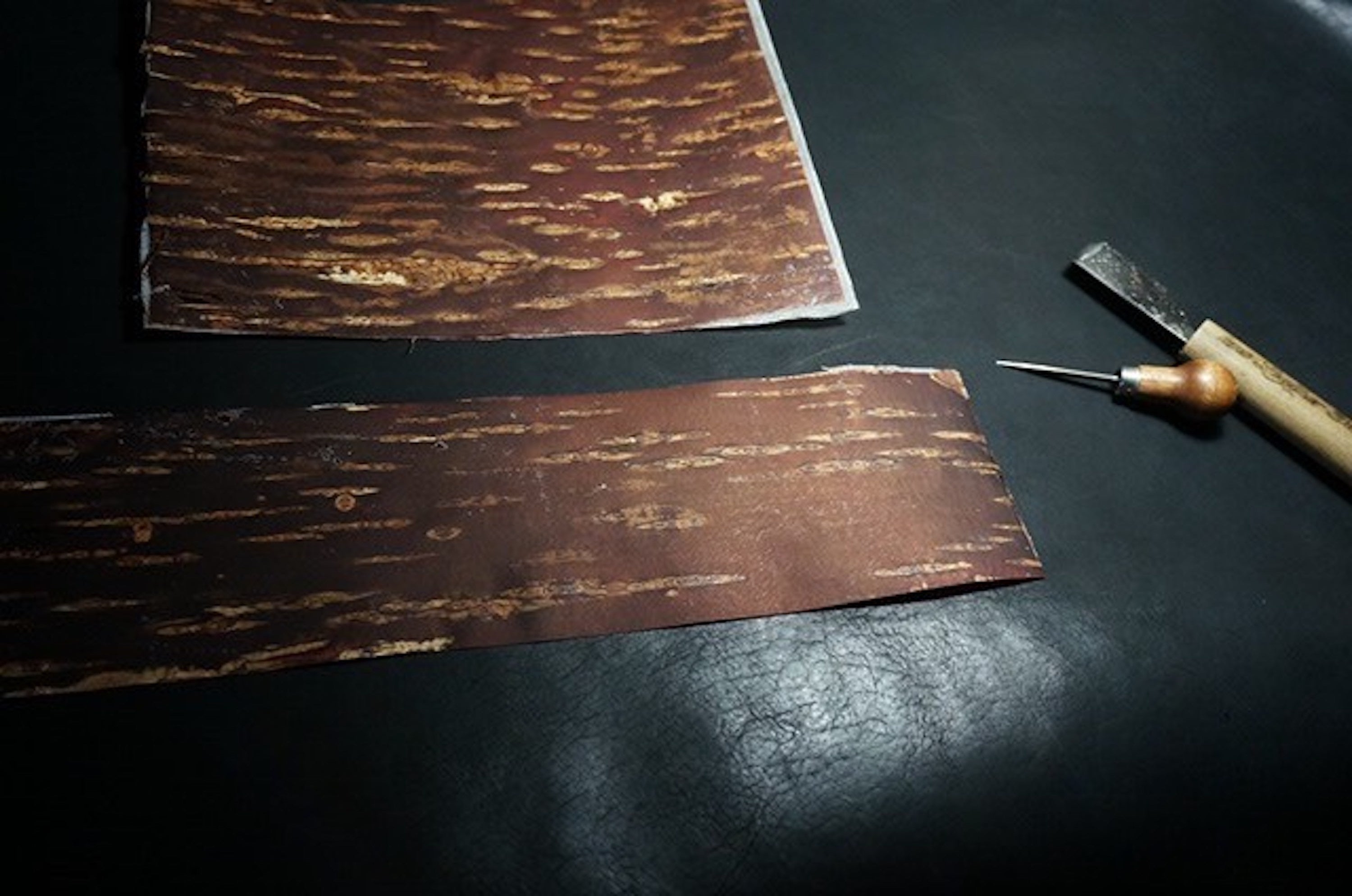 特殊加工が施された樺細工を開発、「湾曲に弱い」という性質を克服しレザーバックに