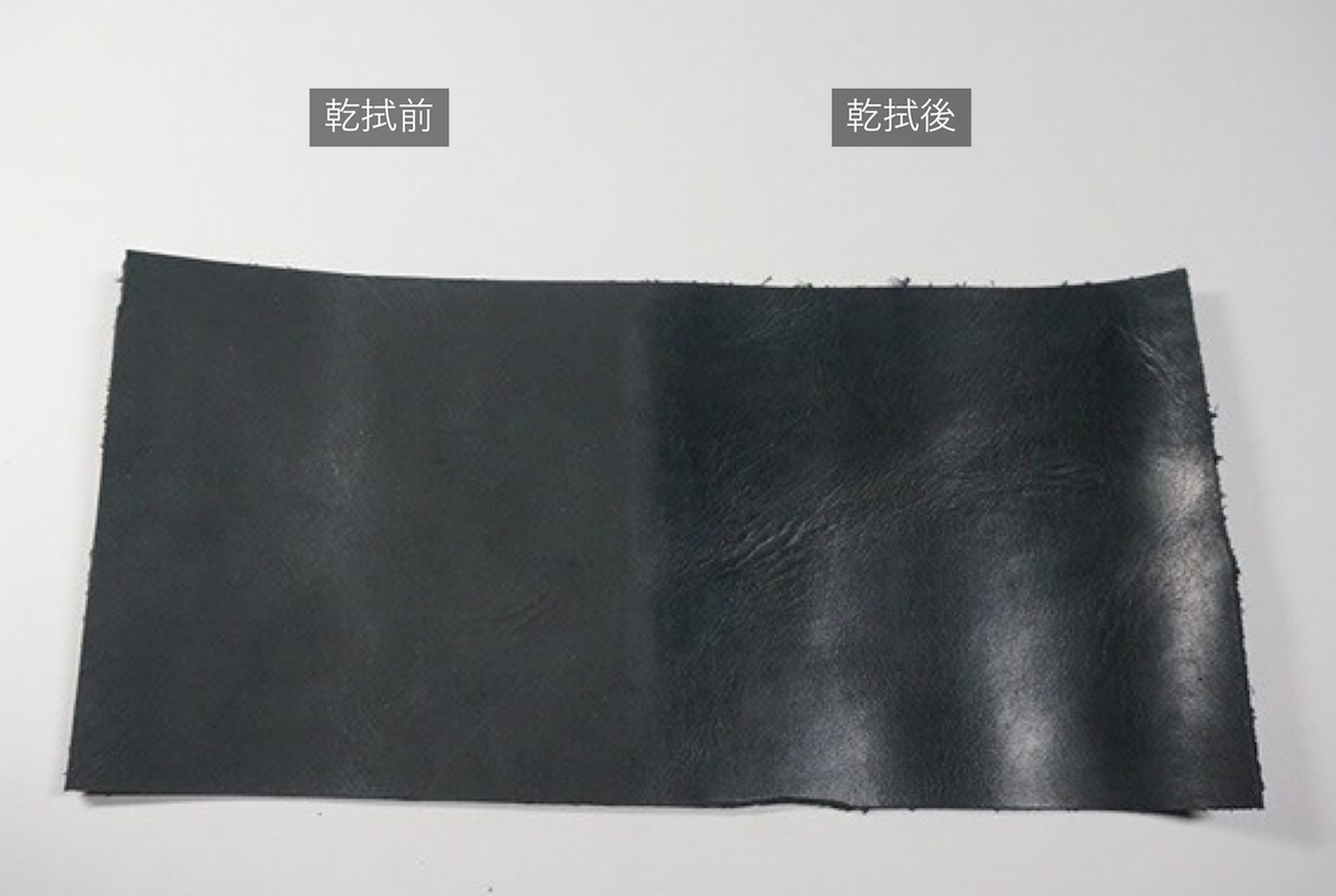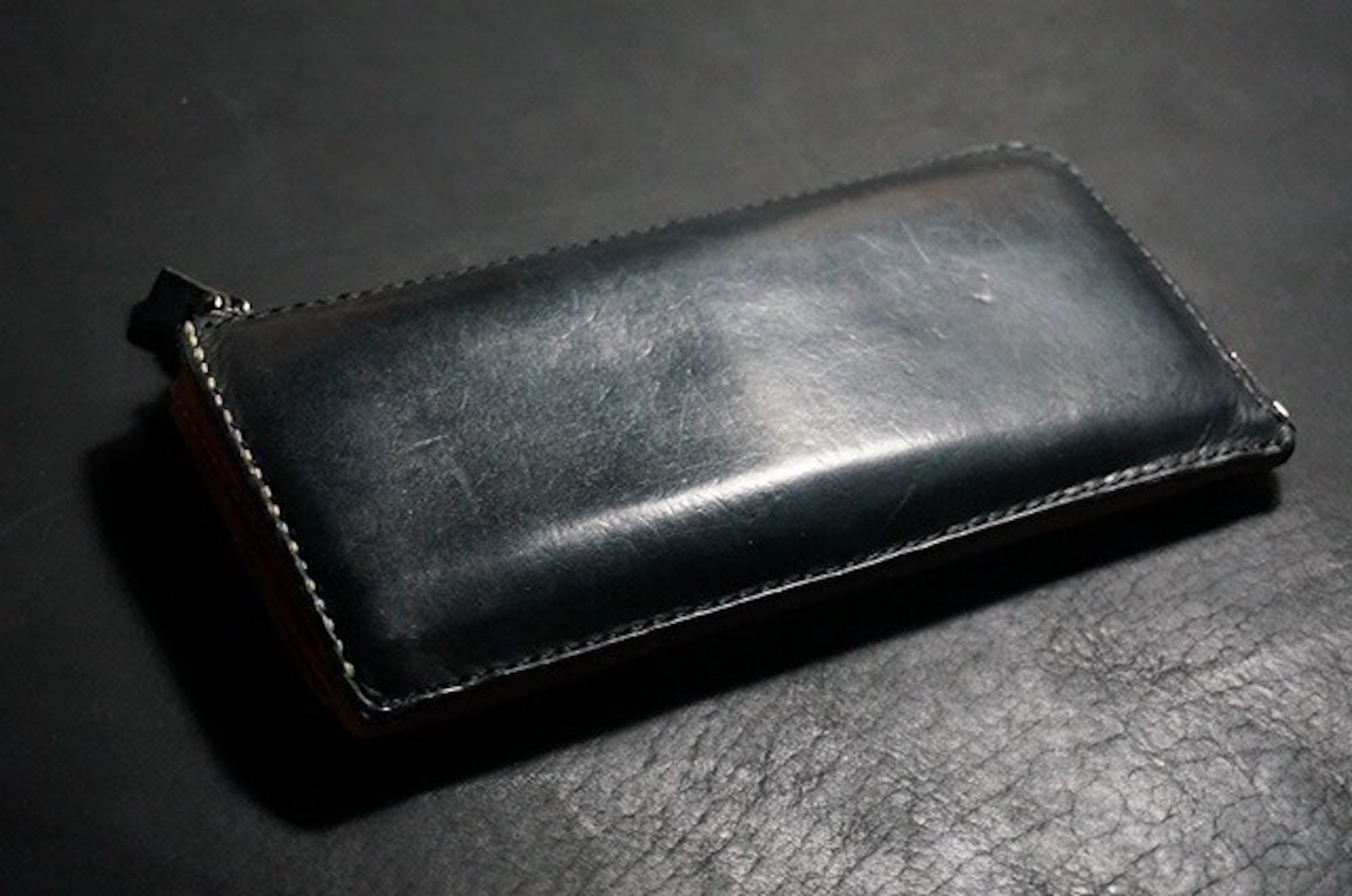 選んだ革は、ベジタブルタンニン鞣しのヌメ革を染料で芯まで染めた後、一枚一枚手塗りでワックスを塗り込み仕上げた国産のもの。使うにつれ、徐々に表面のワックスが内部に染み込み、輝く艶と同時に滑らかな手触りも楽しめます。もし白っぽさが気になるのなら、布で乾拭きすることで「艶のある黒」を使い始めから楽しむことも可能。表面の浮き出たワックスを拭いたとしても、内部までワックスがある程度染み込んでいるので、水にも強い仕様となっております。