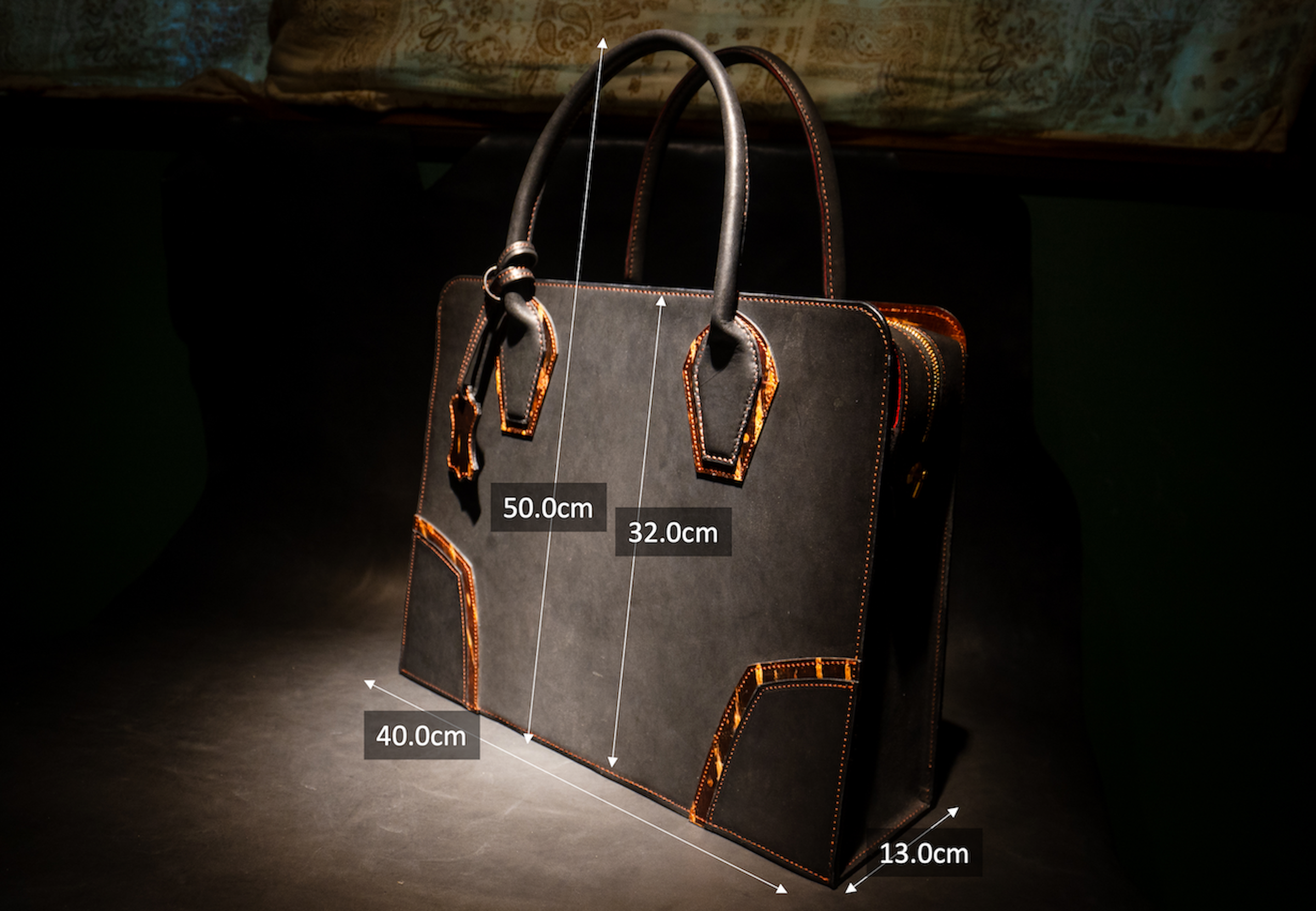 ・サイズ(実寸値):横幅40.0cm×縦50.0cm、マチ13.0cm、ハンドル長さ44cm