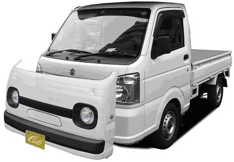 本体の材質はFRP(グラスファイバー、塗装無し)製、部品構成はフロントマスク、ライトベゼル、フロントバンパー、5インチヘッドライト(IPF製)、ウインカー、サイドマーカー、配線類です。比較的簡単に組み付けが出来る様デザインしてあります。車検に関しては車両を軽自動車検査協会 埼玉事務所 所沢支所に持ち込みそのままで、全長の問題はバンパーを外すことなく車検の更新が出来ました。
