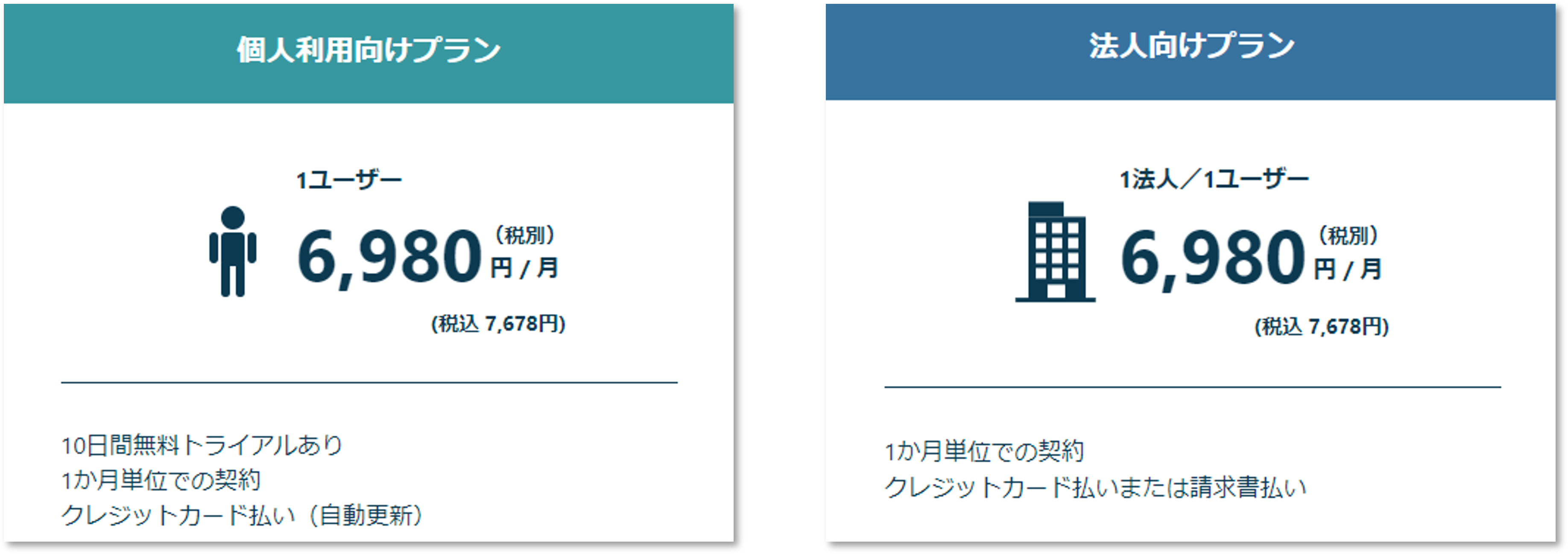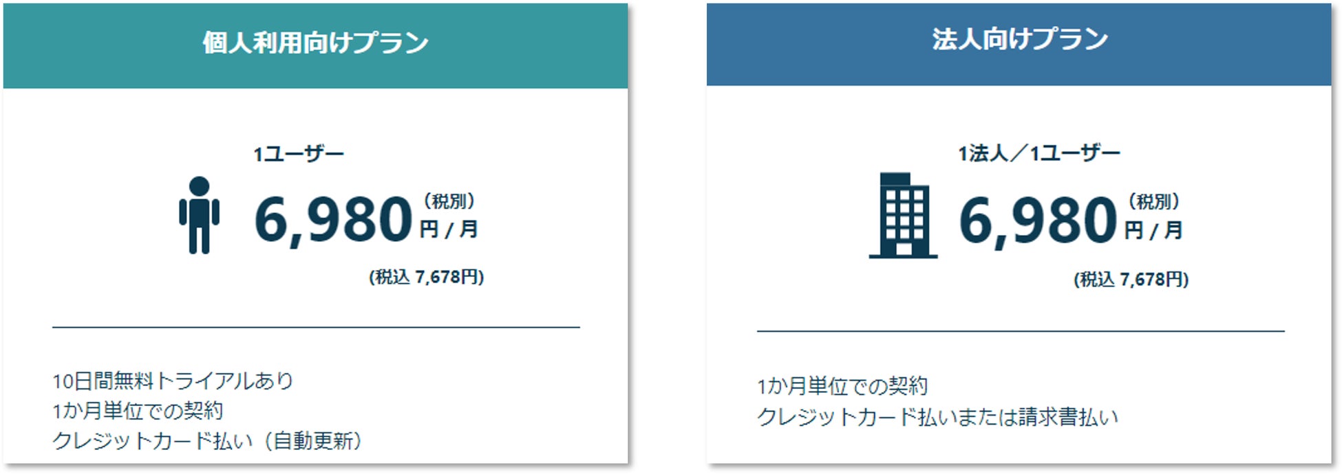 個人、法人向けに、それぞれ「個人利用向けプラン」と「法人向けプラン」をご用意しております。いずれも月額6,980円(税別)にてご利用いただけます。