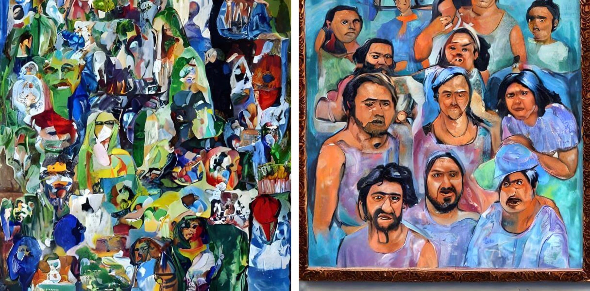 画像生成 AI はしばしばコラージュ的な作品をうみだします (https://bit.ly/3YtiFHr).つまり,多くの画像を積み重ねたような画像がつくられます.左下のように向きが比較的そろっている場合もあり (https://bit.ly/3Lg3JHc),右下のように向きがさまざまな画像がかさなる場合もあります (https://bit.ly/3PwzYEr).さらに,切り抜いたような自由な形の画像がかさなる場合もあります (https://bit.ly/467QEHS, https://bit.ly/3EwzxUz).