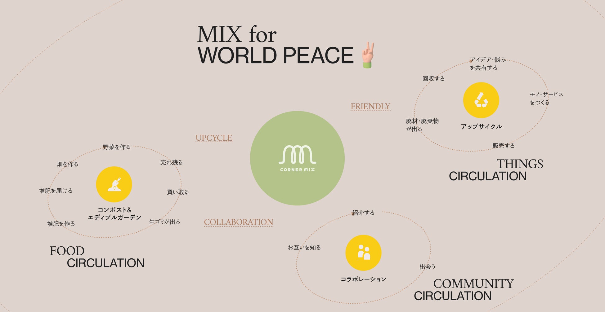 CORNER MIXは、くらしの延長線上で社会課題と向き合えるような、健康で楽しい未来を目指した取り組みを行います。ぐるぐるとまぜることで生まれる豊かな推進力を使って、地域のなかで「ひと」「もの」「食物」の3つの循環を生み出します。