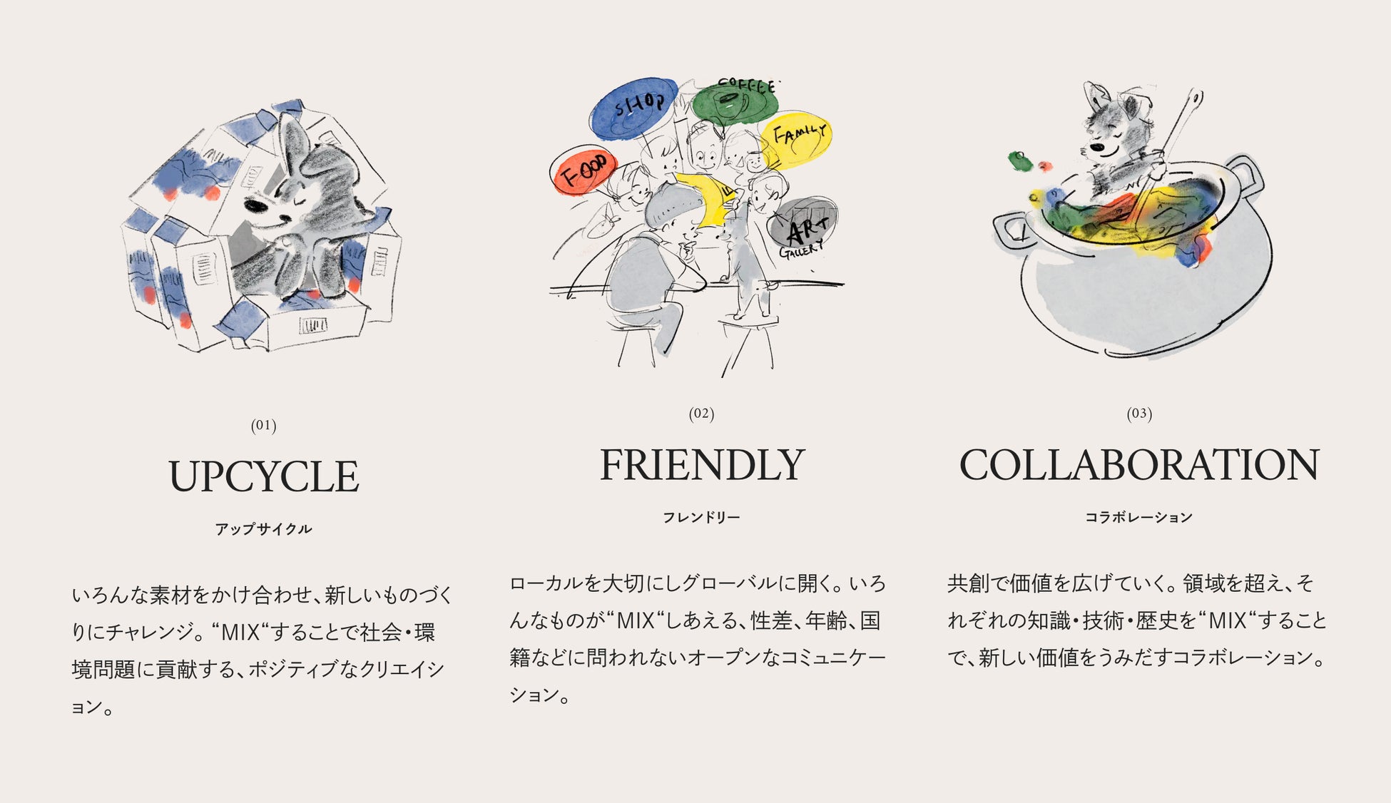 3つのキーワード、「アップサイクル/フレンドリー/コラボレーション」を通じて、 クリエイティブなコミュニティプレイス事業を展開しています。