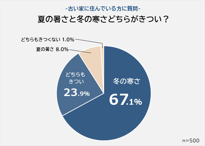 古い家に住んでいる503人に「古い家では夏の暑さと冬の寒さのどちらがきついか」を聞いたところ、「冬の寒さ」と答えた人が67.1%で、圧倒的に多くなりました。