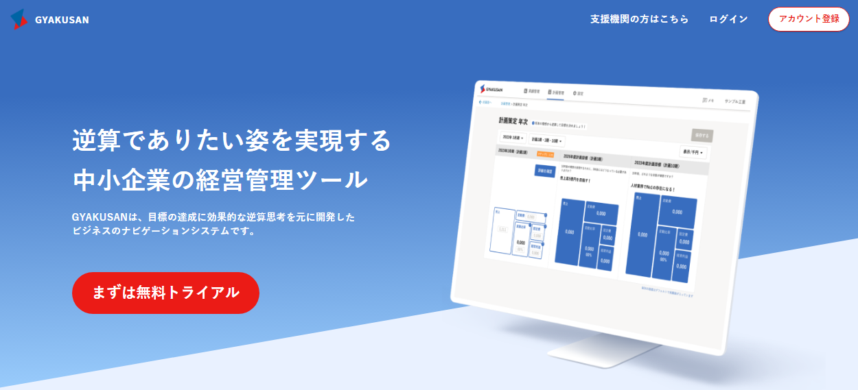 GYAKUSANは、いわばたたき台です。これから事業者の皆様、支援機関の皆様からご意見をいただきながらより良いサービスに育ててまいります。1カ月間の無料トライアルが可能となっております。是非忌憚のないご意見をお寄せください。