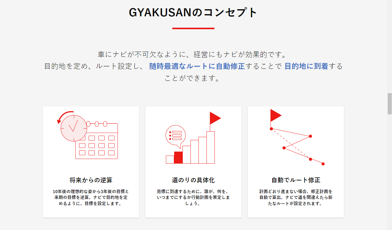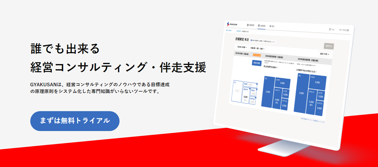 弊社は、すべての事業者様が基本的な経営管理を身に着けることで、日本経済全体が活力を取り戻すと信じています。GYAKUSANは効率的に目標達成するための考え方のフォーマットと言えます。事業経営に限らず、個人の目標、勉強、資格試験、スポーツ、健康などあらゆる分野に活用できます。