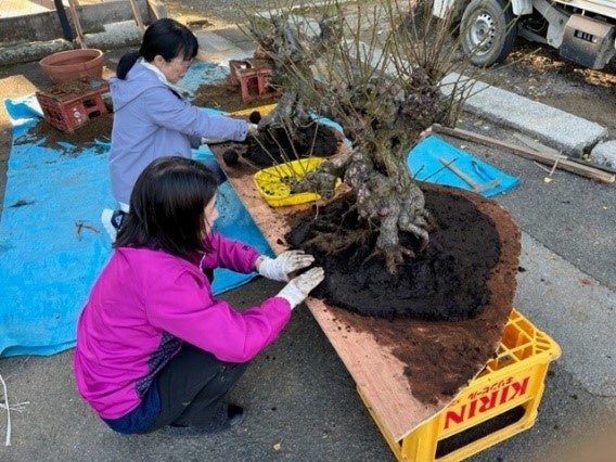 一般の方から募集し、2023年3月から1年間、盆梅の管理方法や楽しみ方を盆梅管理人から学んでもらいました。管理育成した盆梅は琵琶湖や竹生島をモチーフにした鉢に植え替えて、期間中に盆梅展会場で展示します。