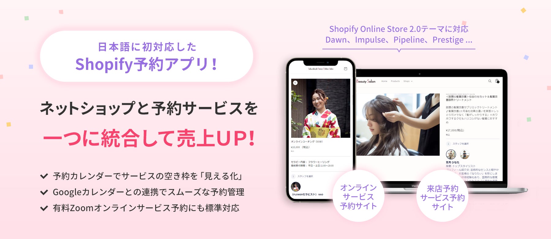 Sakurabookは、これまで難しかったShopifyによる日本語の予約サイト制作がスムーズに行えるようになる予約アプリです。予約サービスをShopifyサイトにシームレスに組み入れることができるため、オムニチャネルショップの来店予約に活用したり、来店前のZoom相談予約に活用したり、全く新しいユーザーエクスペリエンス(UX)をShopifyサイトで提供できるようになります。