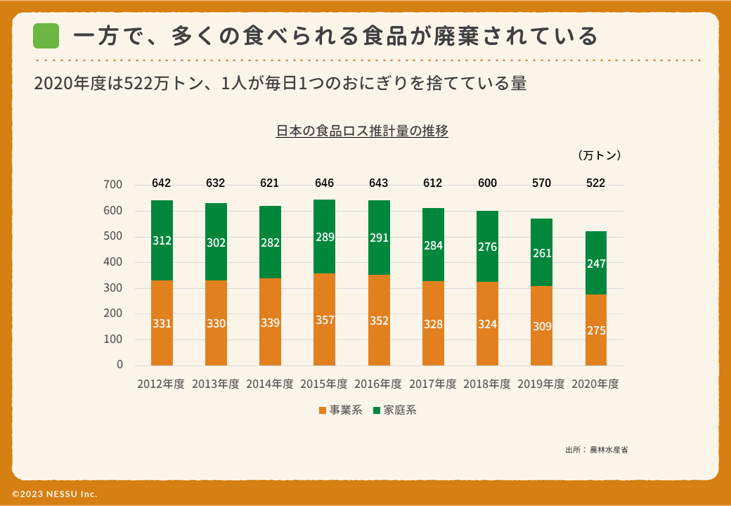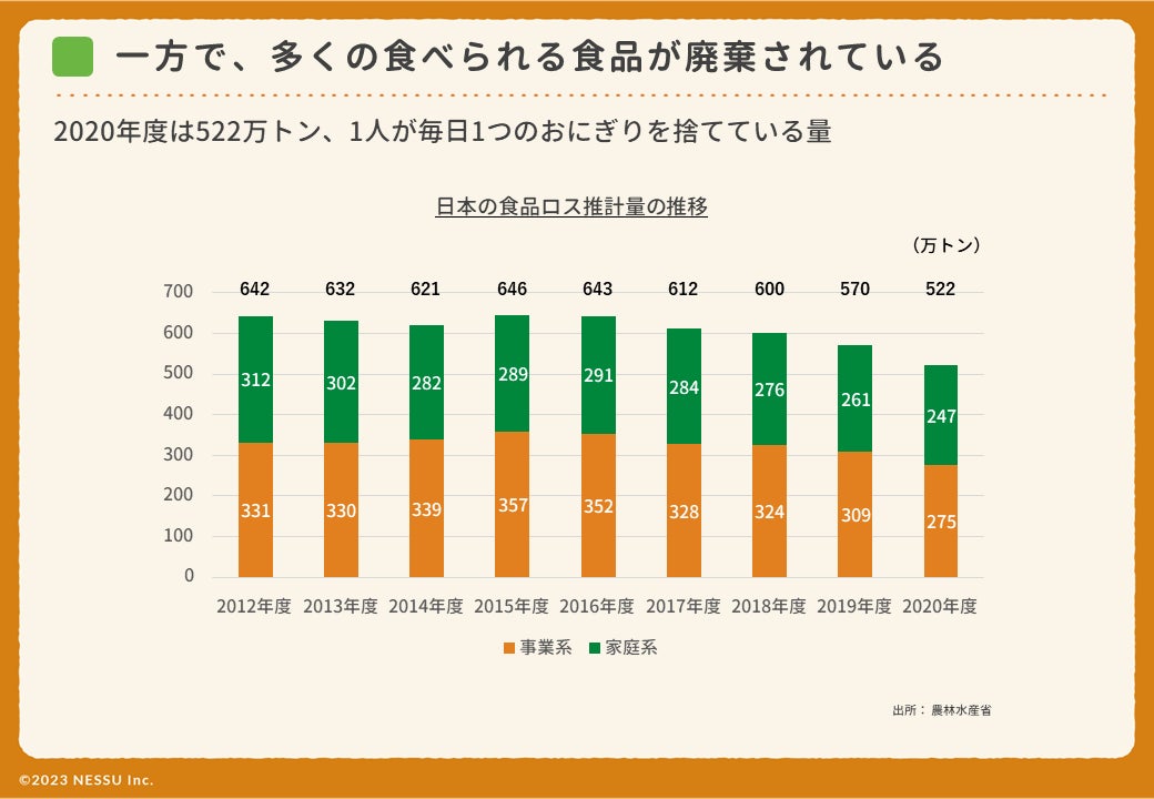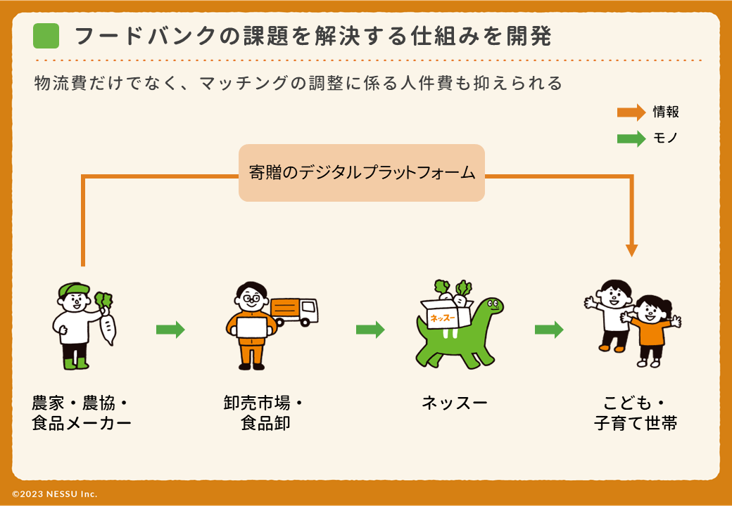 満足に食べられないこどもがいる一方で、大量の食べ物が廃棄されている現状を変え、廃棄ではなく寄贈による支援がスタンダードになれば、多くのこどもの機会格差をなくすことができるのではないか、そう考えてネッスーは活動を開始しました。
