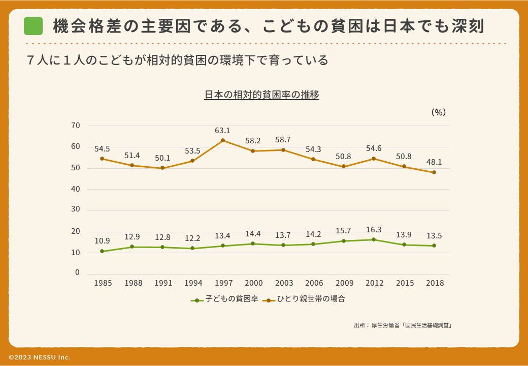 2018年の国民生活基礎調査によると、相対的貧困(所得中央値の半分以下)の環境下で育つこどもの割合は13.5%と、約7人に1人のこどもが貧困状態にあります。また、ひとり親家庭の場合は、48.1%と、約2人に1人のこどもが貧困状態にあります。
