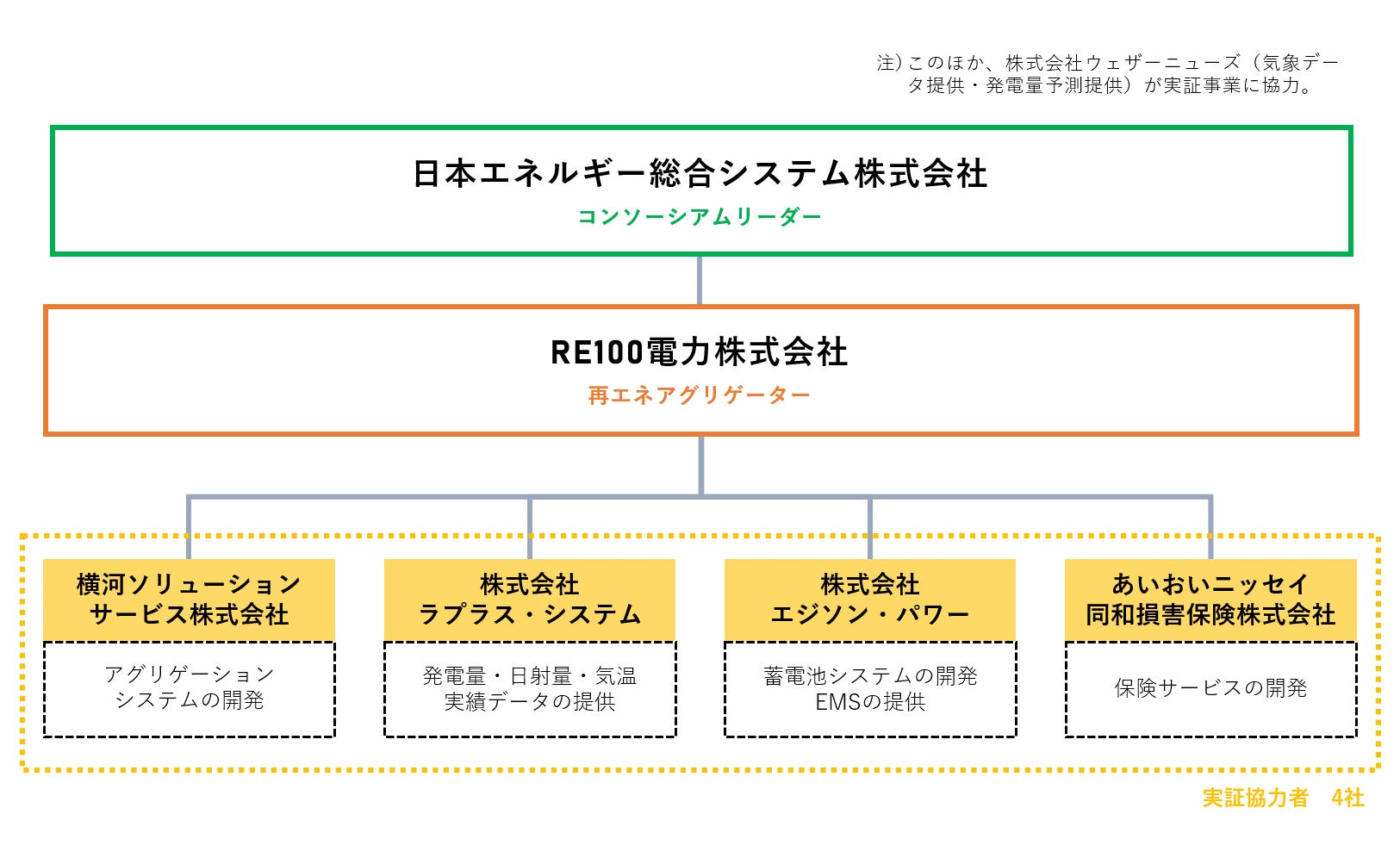本事業は、分散型エネルギーリソースを活用した安定的かつ効率的な電力システムの構築と、再生可能エネルギー(以下、再エネ)普及拡大を図ることを目的に、需給バランス確保のための発電量予測や、リソース制御に必要となる技術等の実証を行うものです。本実証では、JPNがコンソーシアムリーダーを務め、RE100電力はアグリゲーター、他4社の実証協力者を含むコンソーシアム※2を編成し、蓄電池を活用した太陽光の発電予測精度向上やインバランス低減、市場取引での採算性向上など計7つの項目において検証しました。