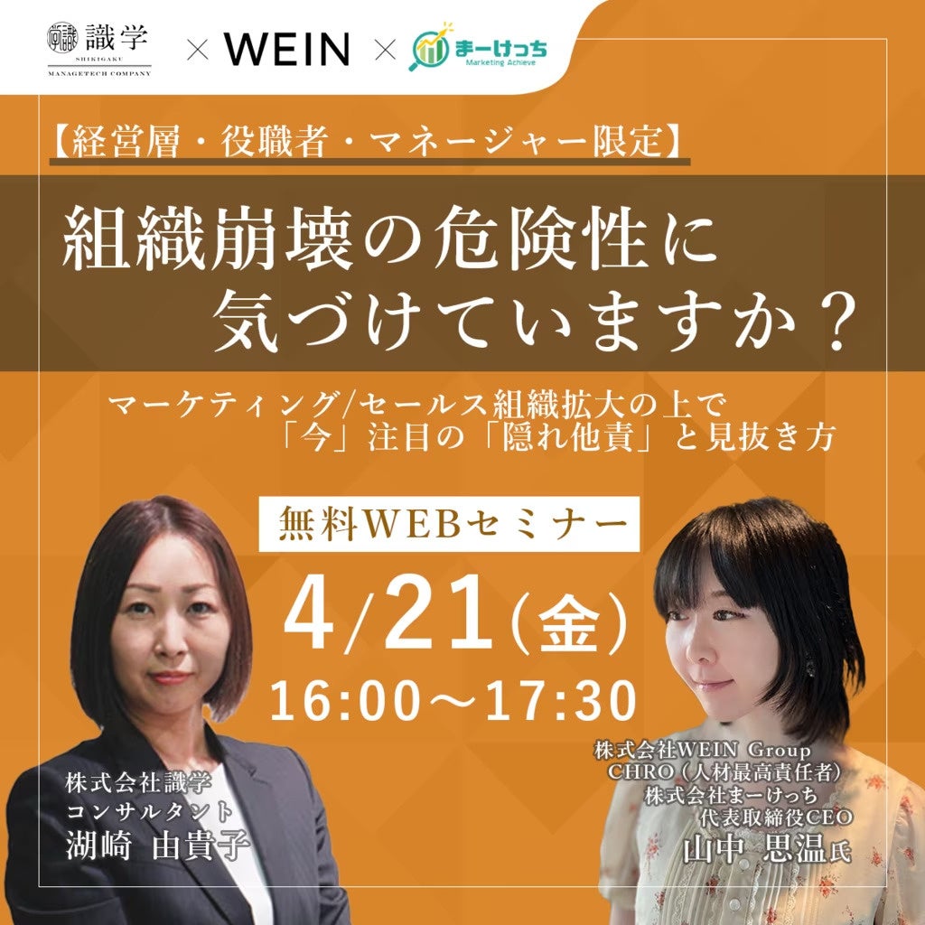 WEINGroupの株式会社まーけっち(東京都港区、代表取締役社長:山中、以下、まーけっち)は、4月21日(金)にオンラインセミナー【経営層・役職者・マネージャー限定】組織崩壊の危険性に気づけていますか?〜マーケティング/セールス組織拡大の上で「今」注目の「隠れ他責」と見抜き方〜を開催いたします。