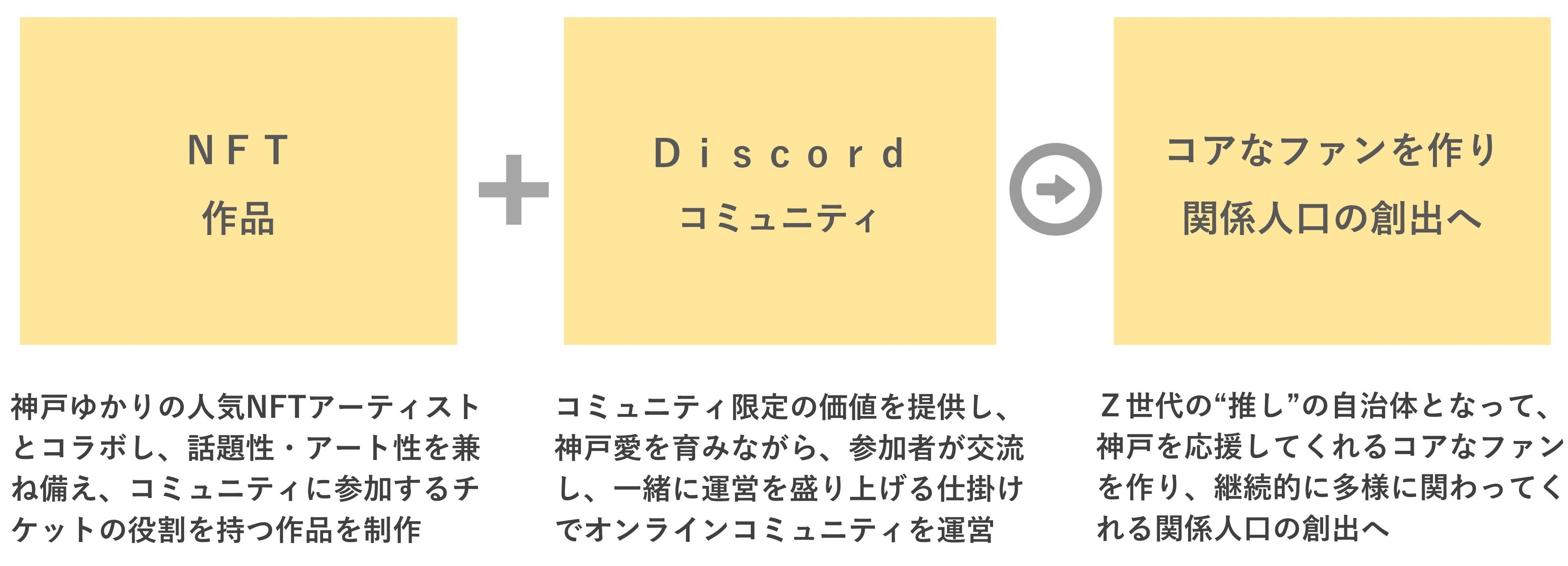 神戸市は、Z世代向けクリエイティブ事業を展開する合同会社rakugoka、株式会社uzumaki creativeと協働し、東京圏のZ世代をメインターゲットに、神戸をモチーフにしたNFT作品を制作するとともに、作品取得者などがチャットツールDiscord上で集い交流し、地域を越えて神戸と“つながる”コミュニティを創出する実証プロジェクトを開始します。