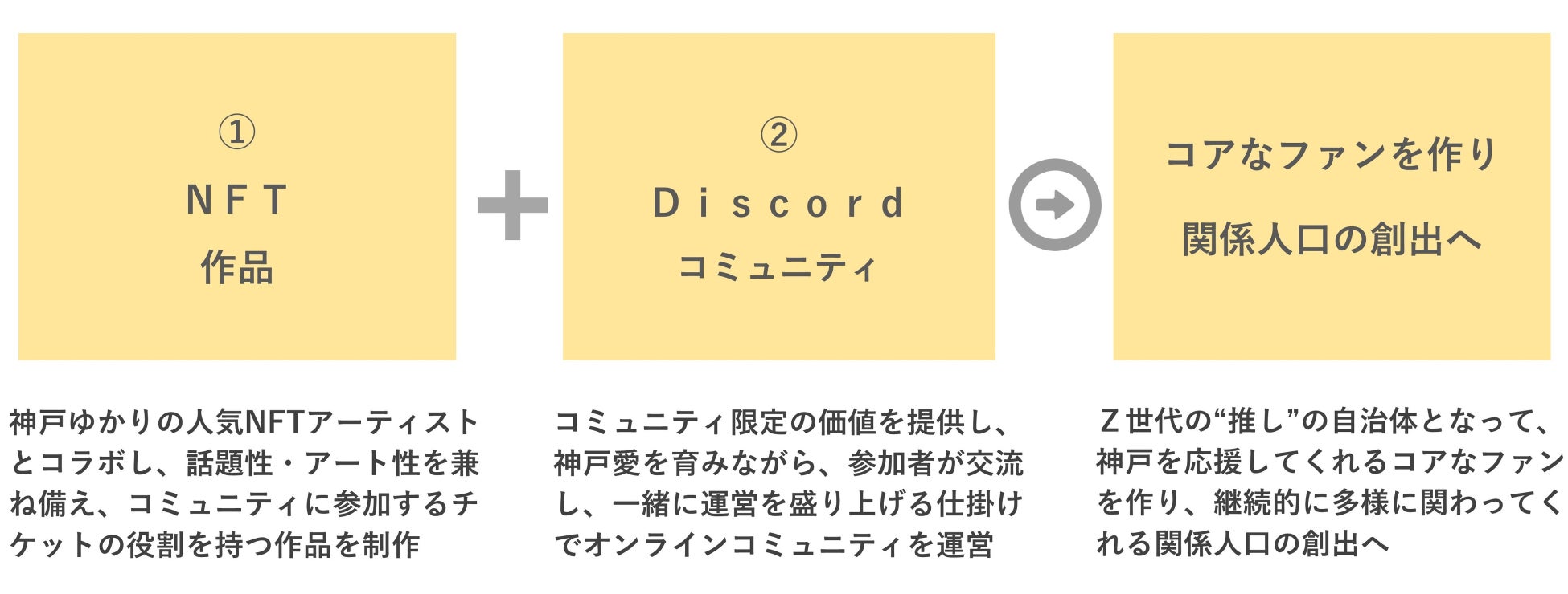 そこで、コミュニティ形成機能に着目してNFT作品を制作するとともに、Z世代の利用が多いチャットツールDiscordを活用し、自治体として初めてNFTをきっかけに東京圏のZ世代と地域を越えて“つながる”オンラインコミュニティを運営します。熱量の高いコミュニケーションで神戸愛を育み、Z世代の“推し”の自治体となって関係人口の創出を目指します。