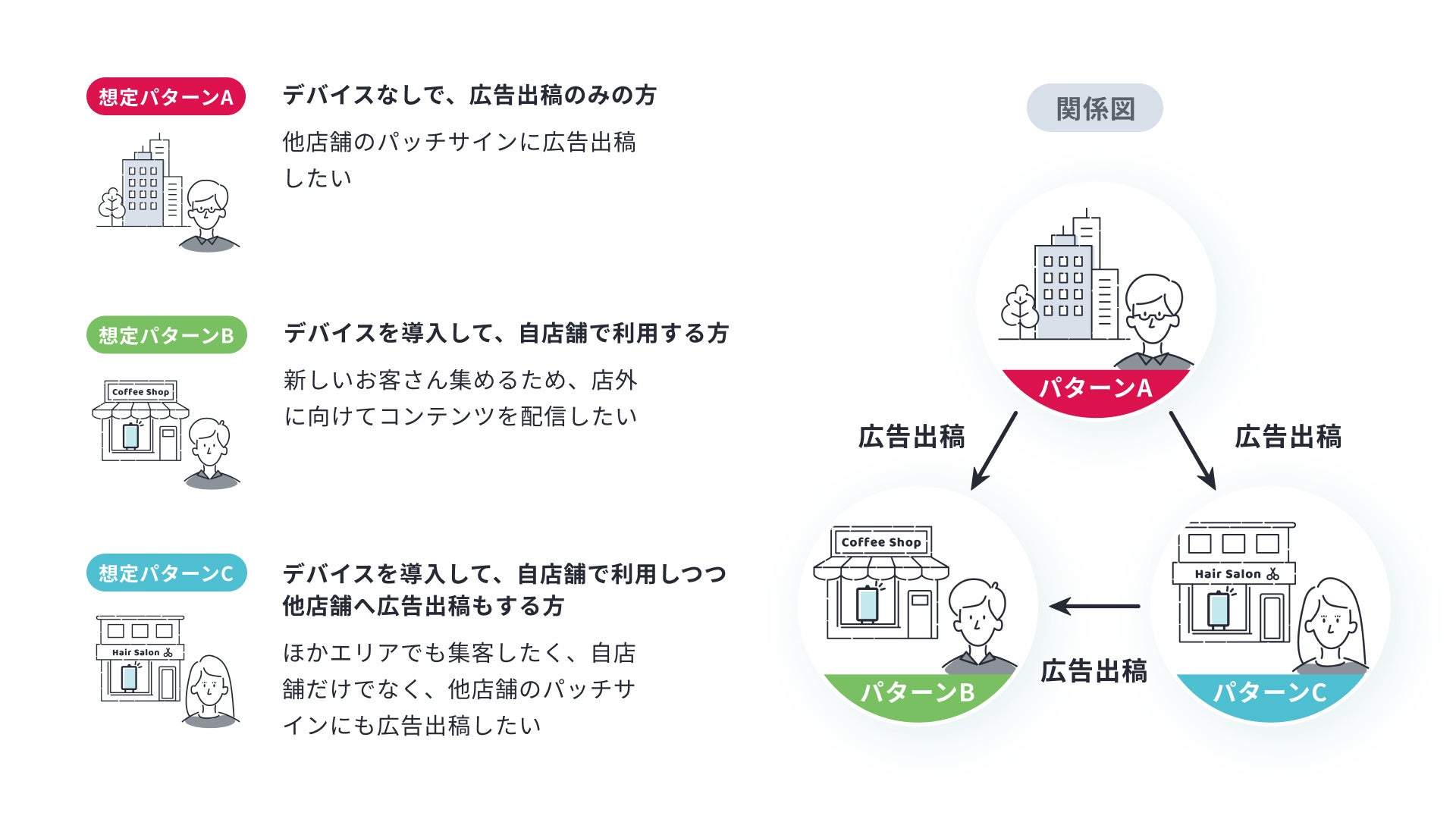 これまで自店に設置したデジタルサイネージは「自店の広告のみを表示する」のみでしたが、Patchsignでは「他店の広告を表示する」ことができます。例えば、自店の広告が5回流れたら他店の広告が1回流れるといった設定が可能となり、他店の広告が流れた場合は「広告収入を得る」ことができます。
