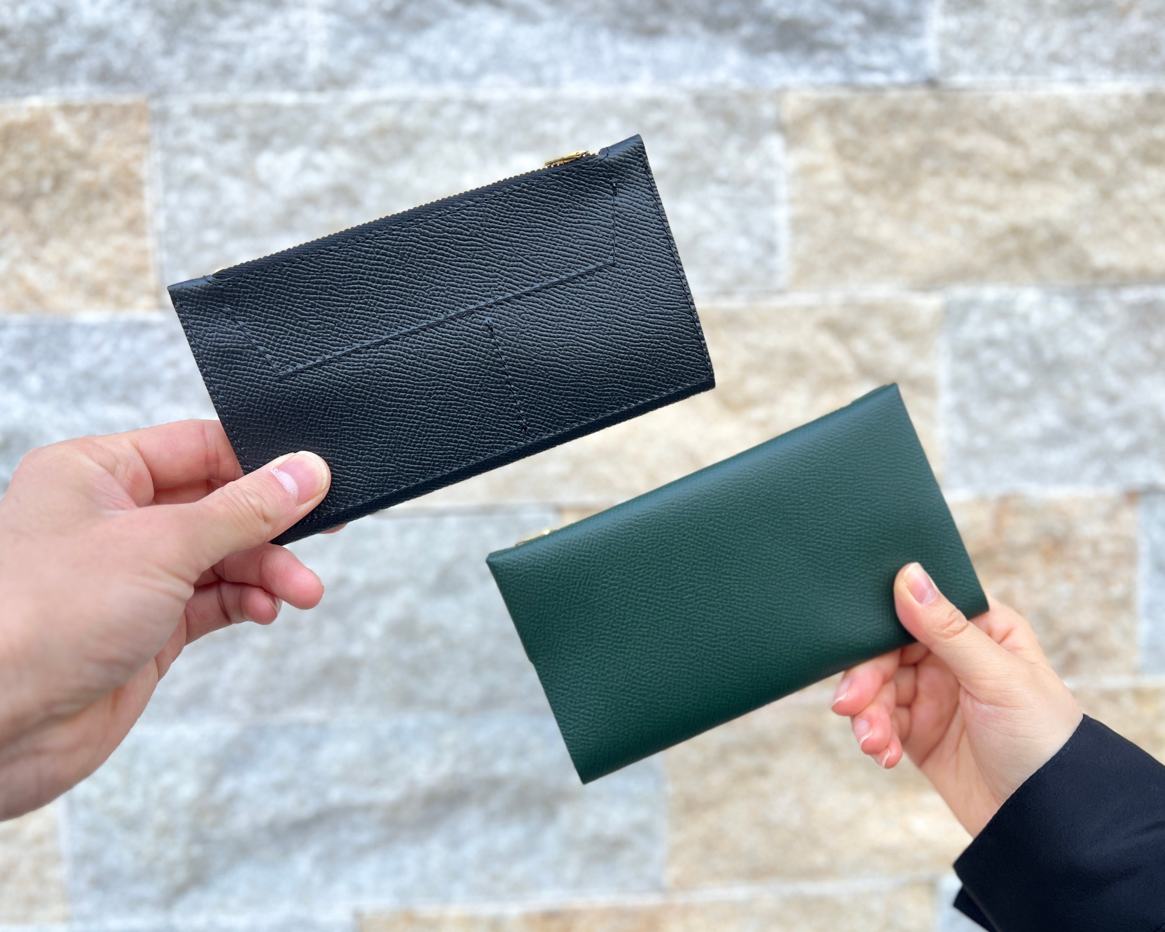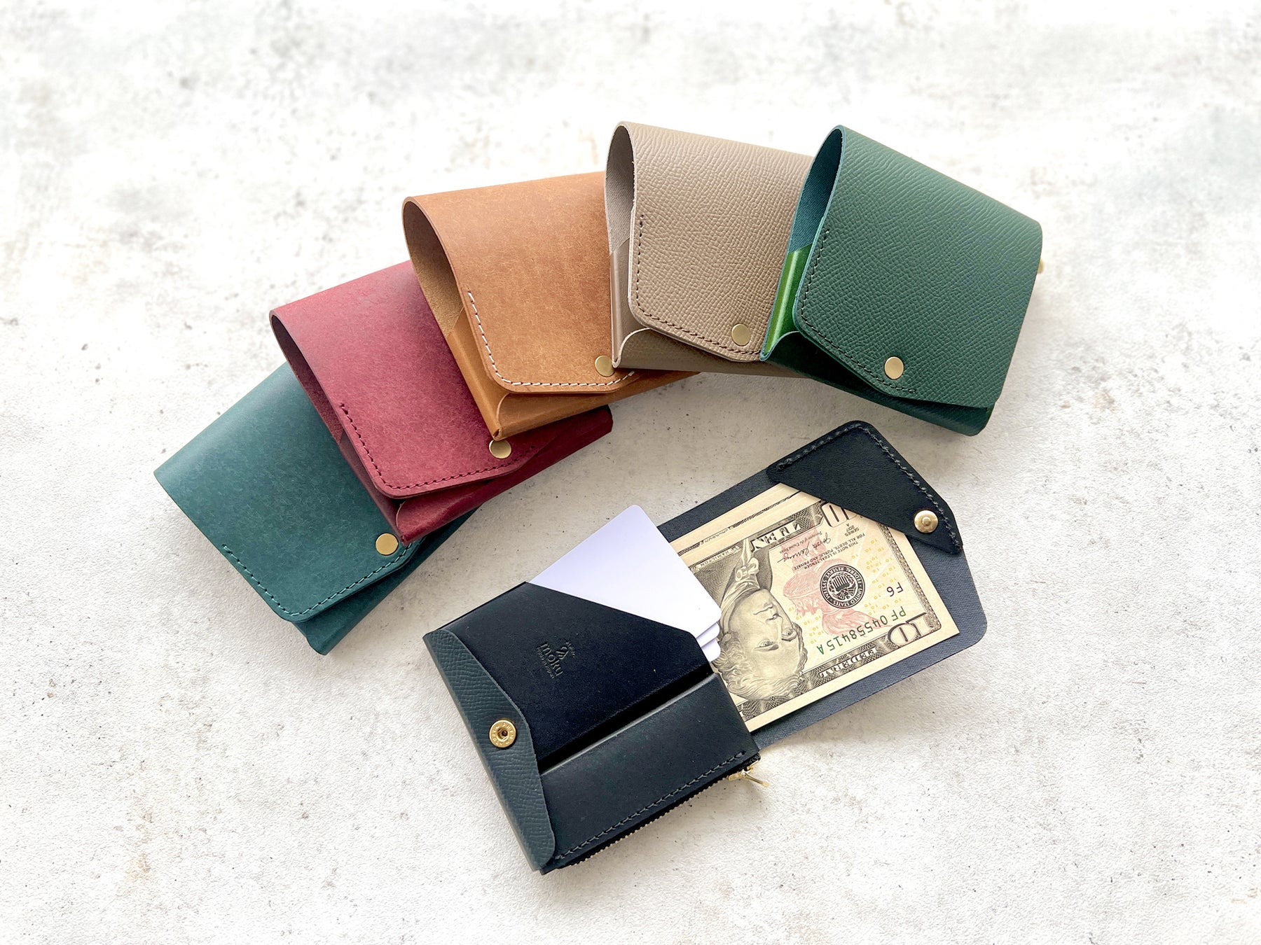 世界最小を目指すコンパクト長財布。一万円札の横幅より3mmしか大きくないミニマルデザインながら、最大容量はカード13枚、硬貨25枚、紙幣30枚と十分な収納力を持つ。
