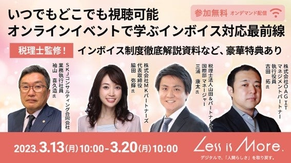 「オンラインで学ぶインボイス制度最前線」では3月13日(月)から20日(月)の8日間、今年の10月に迫ったインボイス制度対応に関するあらゆる情報を動画で自由に収集いただけます。