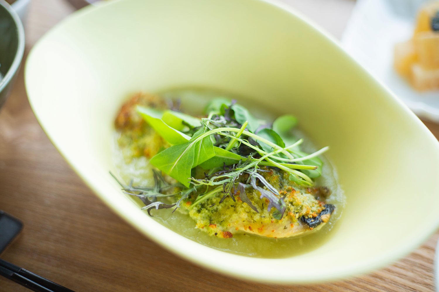 主菜 鰆のフレッシュハーブパン粉焼き 春キャベツソース
