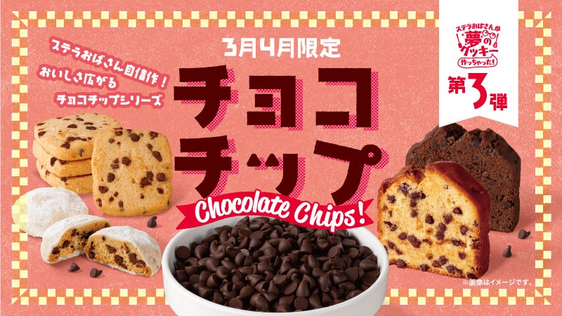 森永製菓株式会社(本社・東京都港区、代表取締役社長・太田栄二郎)のグループ会社で、アメリカンカントリー焼き菓子専門店『ステラおばさんのクッキー』を展開する株式会社アントステラ(本社・東京都港区、代表取締役社長・高波健二)は、「ステラおばさんが夢のクッキー作っちゃったプロジェクト」第3弾において、人気NO.1のチョコレートチップクッキーに使用している、クッキーにあうオリジナルチョコチップを使用した≪チョコチップシリーズ≫4種を3月6日(月)~4月30日(日)の期間限定で新発売いたします。
