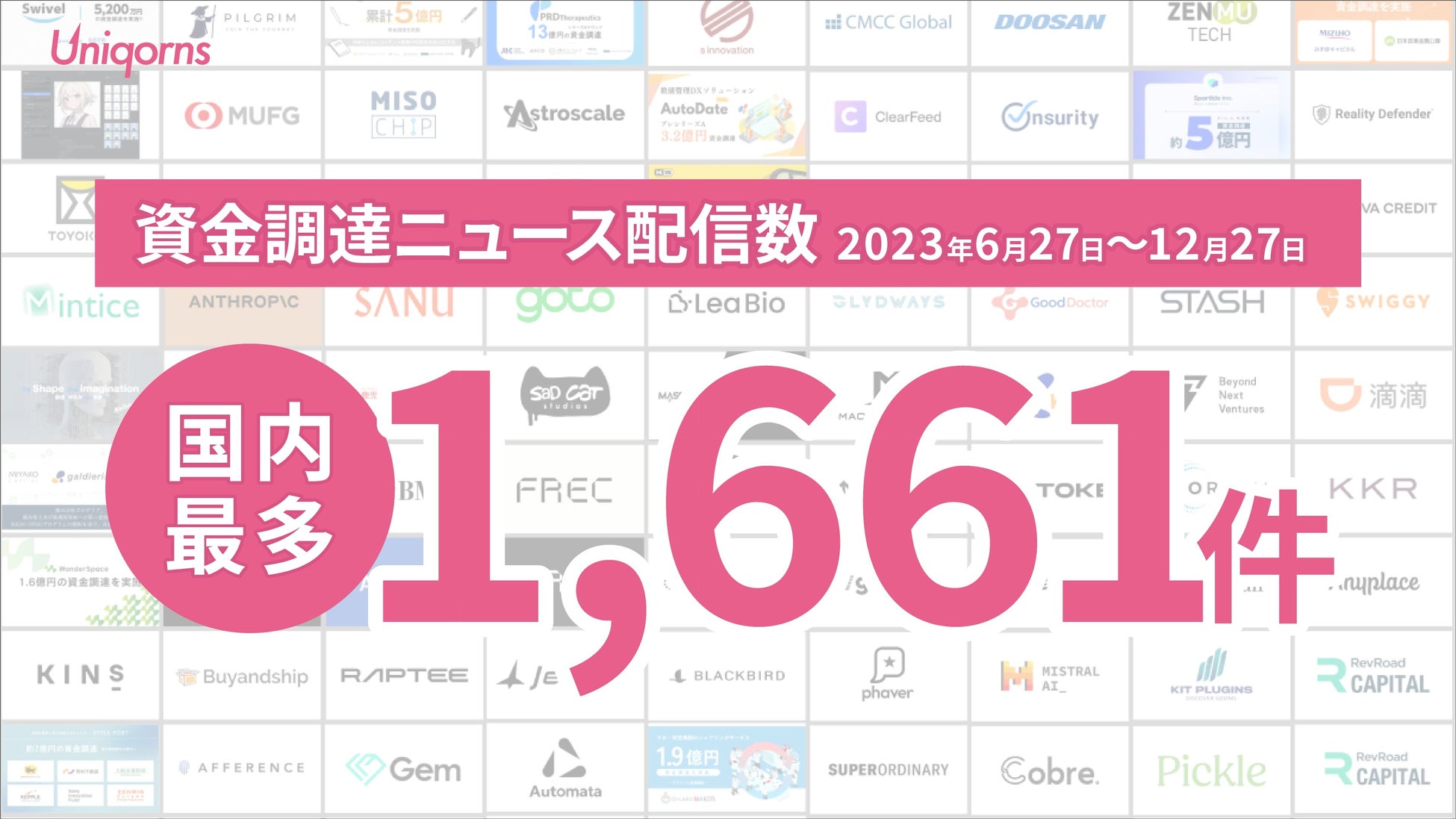 株式会社EmolutionCreativeが運営する「uniqorns」は、2023年6月27日から同年12月27日の6ヶ月間で1,661件の資金調達ニュースを配信しました。この数字は、国内スタートアップメディア中で最多となりました(自社調べによる競合他社との比較データを含む)。