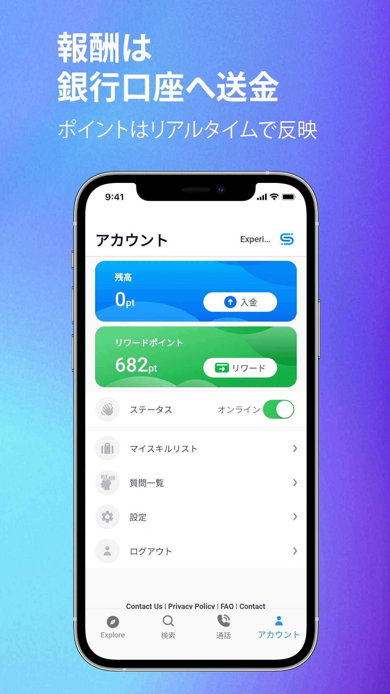 - スキルをプライスに。相談相⼿とあなたをつなぐ通話アプリ『Experienshare』で、「ポイントプログラム」から不正防⽌機能のSMS認証を済ませると500 ポイントが付与されます。※付与されたポイントは『Experienshare』内の通話で利⽤できます。