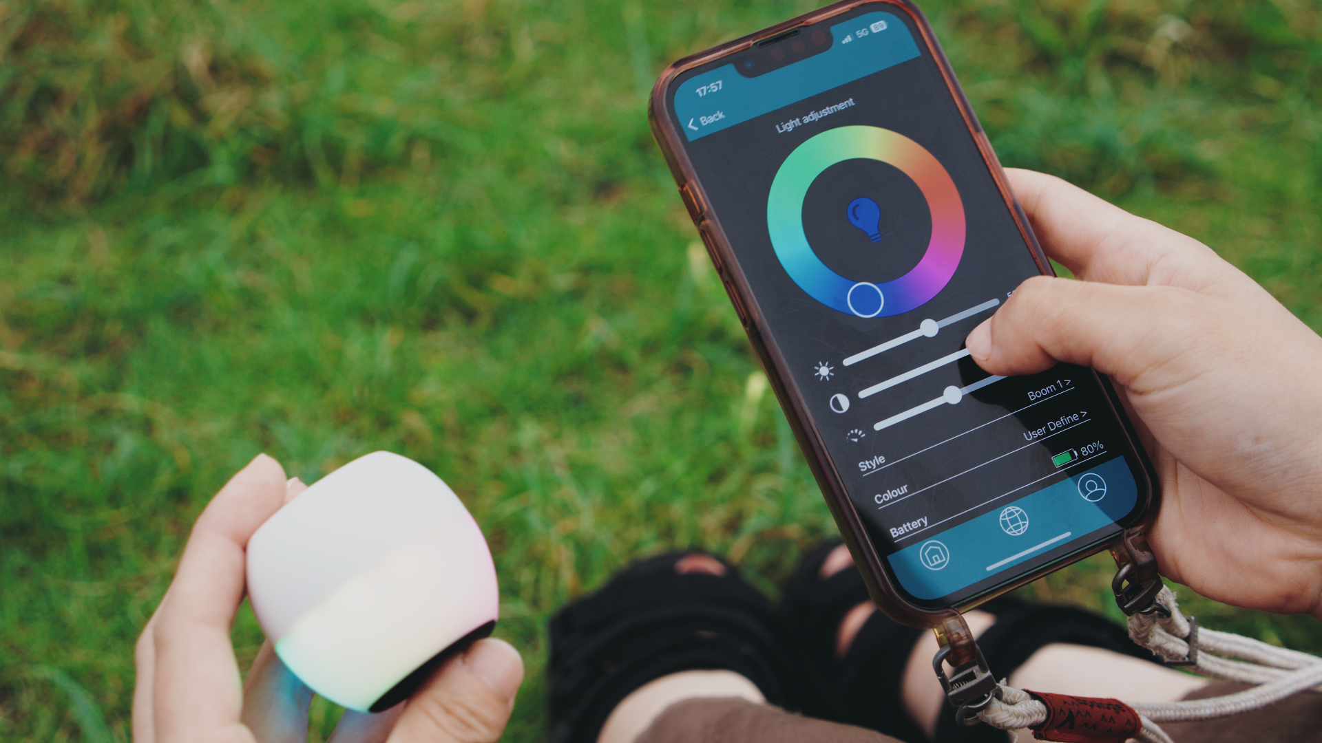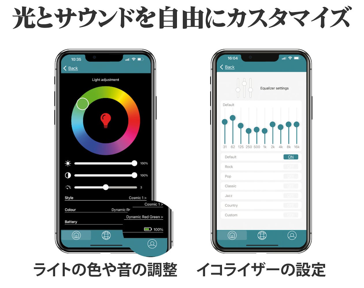 音に合わせて光が動き、専用アプリで音と光を自分好みに調整可能。