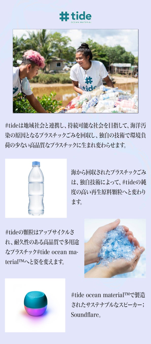『Soundflare』は、海洋プラスチック問題の原因であるオーシャンバウンドプラスチック(OBP)を100%アップサイクルする世界初の企業Tide Ocean SA(本社:スイス)の高品質再生プラスチック「#tide」を使用して作られております。