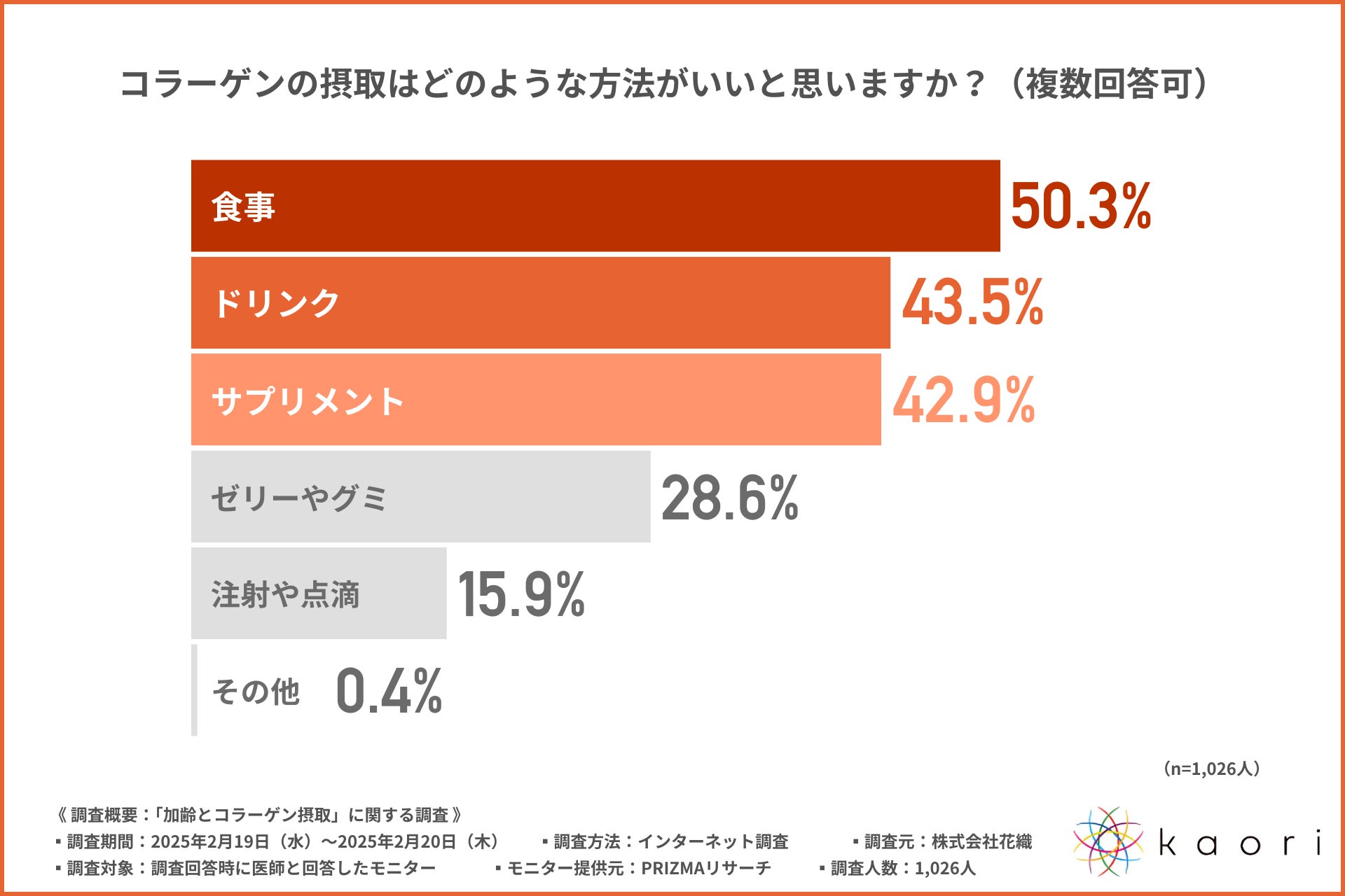 「コラーゲンの摂取はどのような方法がいいと思いますか?(複数回答可)」と質問したところ、『食事(50.3%)』と回答した方が最も多く、『ドリンク(43.5%)』『サプリメント(42.9%)』と続きました。