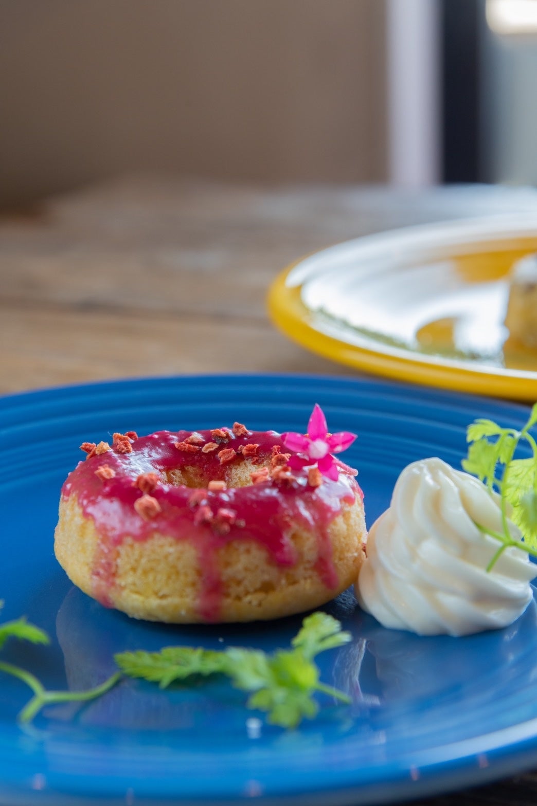カラフルなVeganフロスティのかわいいふわふわ焼きドーナツ 自家製豆乳クリーム添え