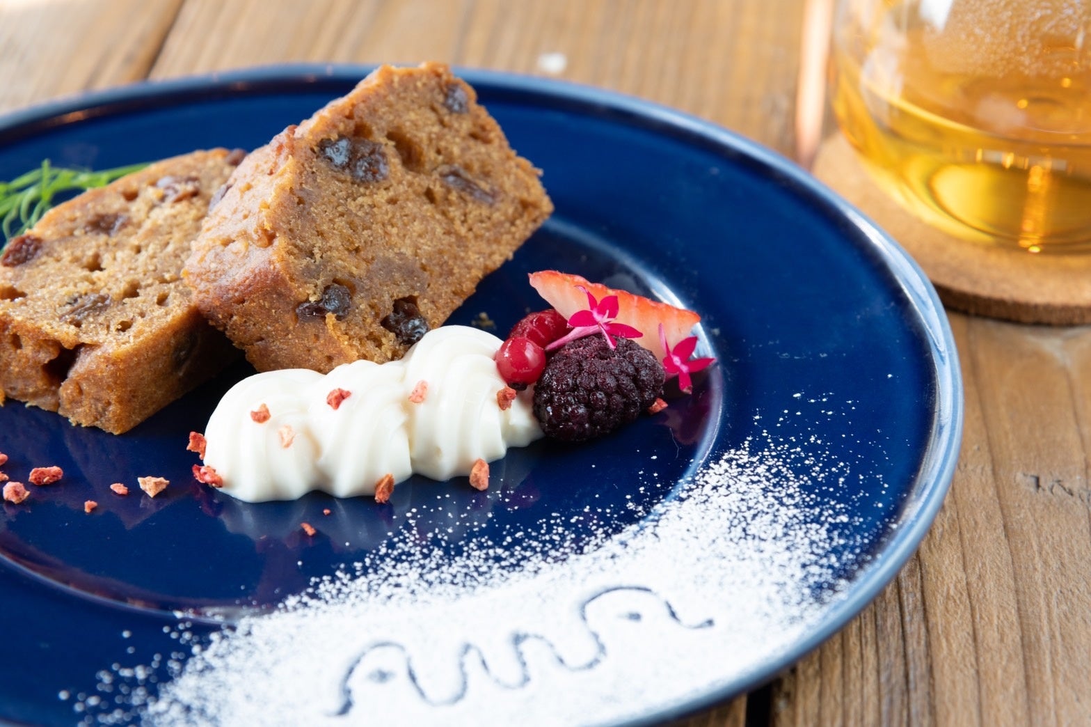 デーツペーストたっぷり、シュガーフリー&ナッツフリーで濃厚なのにギルトフリーなパウンドケーキです。自家製豆乳クリームと一緒に。