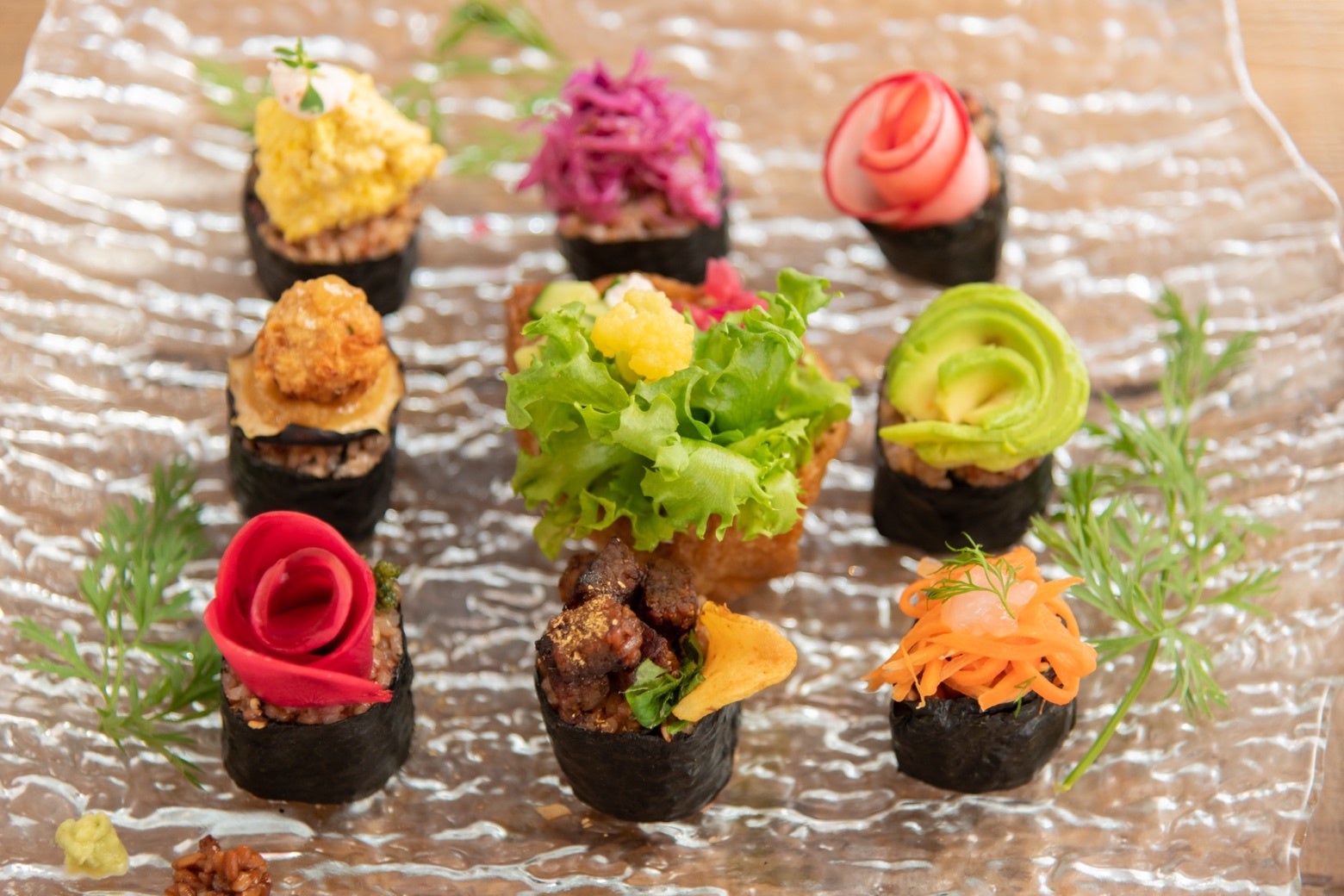テンペのあなご風、アボガド、卵もどき、れんこんボール、茄子田楽、サラダ稲荷などいろいろな味が五感で楽しめます。酢飯は梅酢と自家製コンブチャで作るAUWAでしか食べられないオリジナル。腸活寿司で体の中から美しく健やかに。