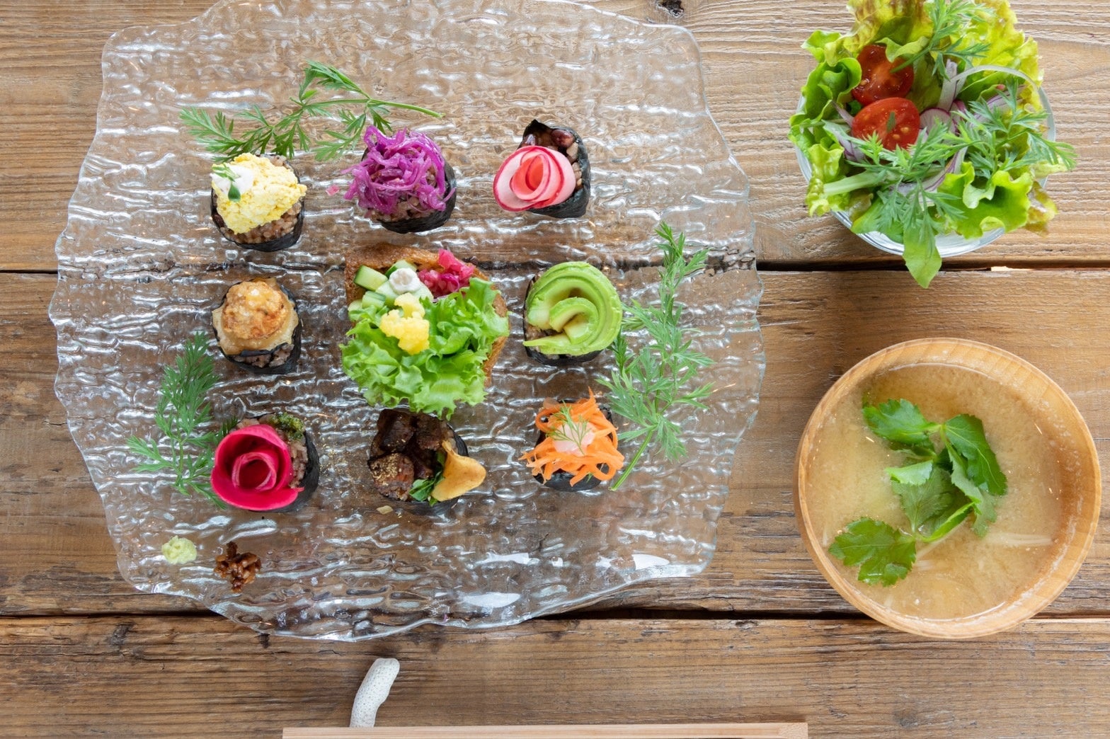 兵庫県内のオーガニック農家さんから届く旬の野菜料理とヴィーガン・シーフードのたっぷり乗った発芽酵素玄米の「オーシャンガーデンブッダプレート」や、海と山の調和をイメージした「2種のカレープレート」淡路製麺のリングイネを使った旬のパスタ(グルテンフリーの自然栽培玄米麺に変更可)、のほか、平日限定でAUWAでしか食べられない彩りも美しい「Sushi Roll プレート」をご用意。