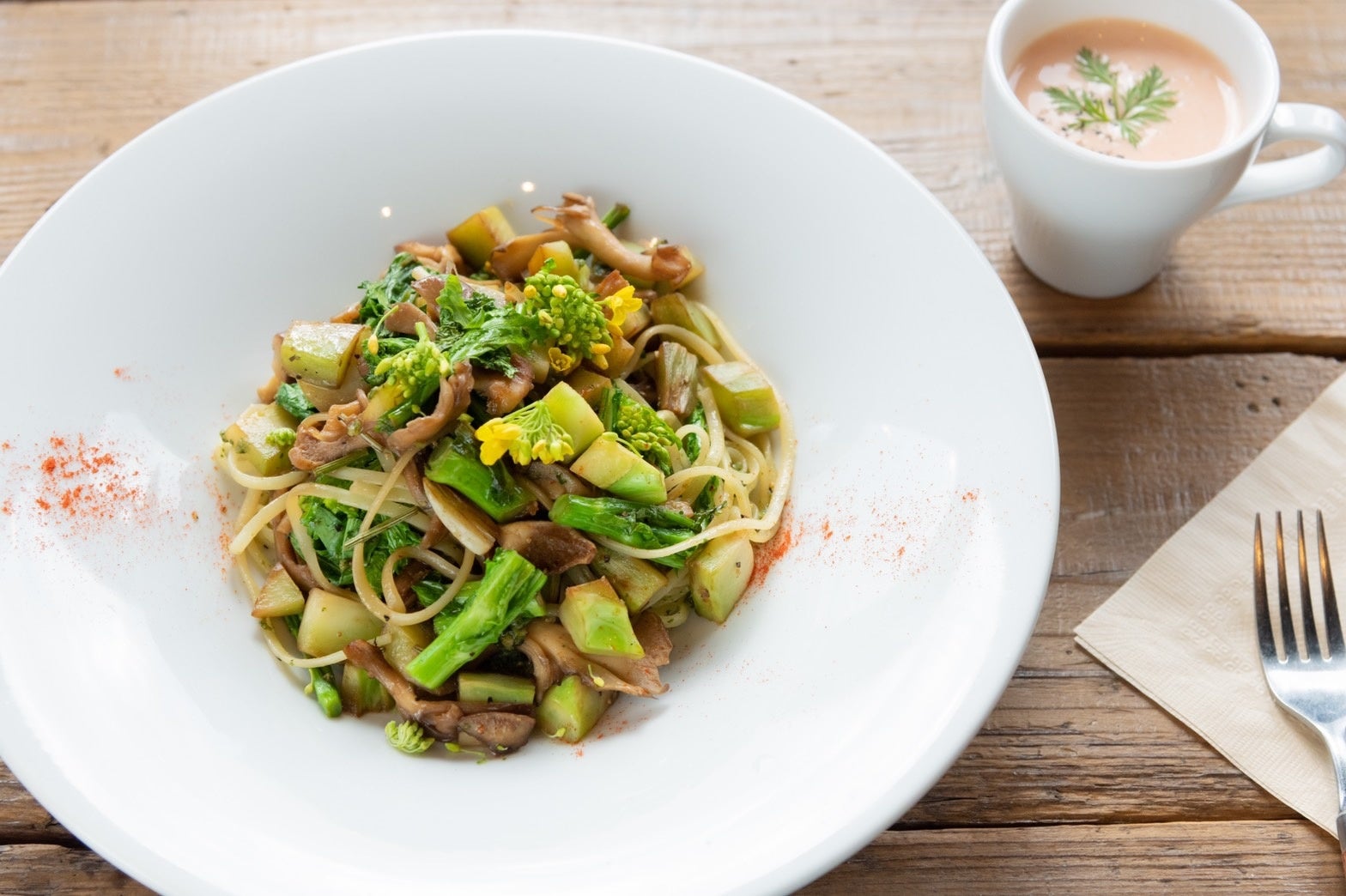 淡路製麺のリングイネを使った旬のお野菜たっぷりの日替わりパスタ(ジェノベーゼ、トマトソース、豆乳クリームソース、ペペロンチーノなど)+110円で自然栽培玄米の黒米入りグルテンフリー麺に変更可。