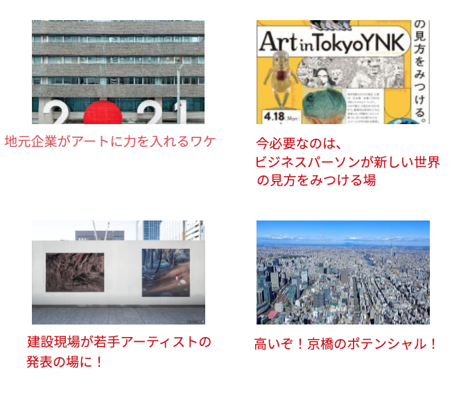 再開発が盛んに行われている日本橋・京橋エリアでは、地元の大手企業も「アートと文化の街」として側面に着目し、芸術文化に関連したイベントや事業が進められています。そのような情報も企業と連携しながら発信し、「アートと文化の街」としてなお一層地域全体の活性化に貢献して参ります。