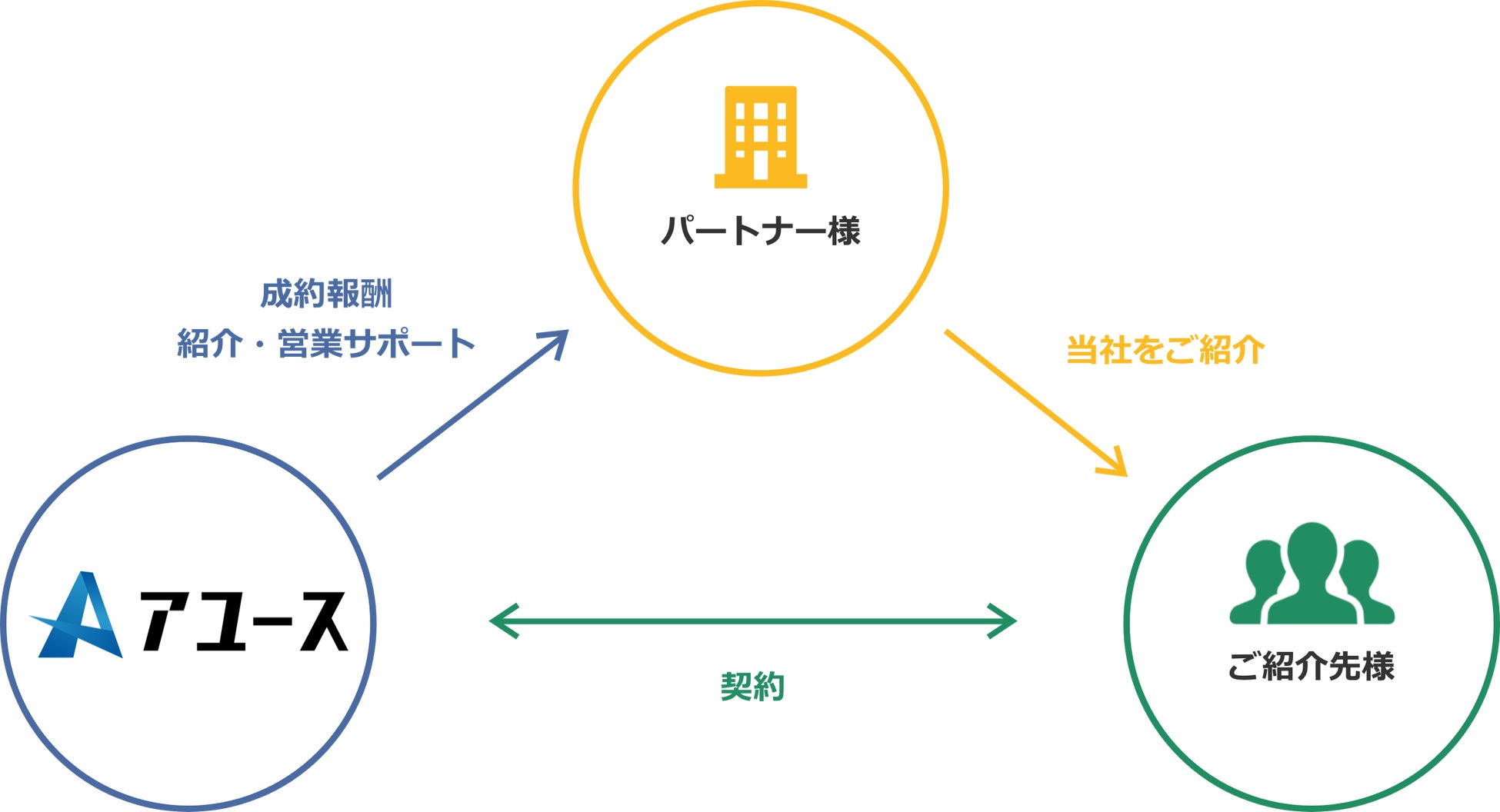 弊社のパートナー制度は、パートナー様よりお客様、又はお知り合いの企業様に弊社をご紹介いただく制度です。ご紹介いただいた後、お客様へのサービス説明や契約・その後の運用フォローはすべて弊社が担当します。お客様がご成約に至った際に、その成約数に応じて販売パートナー様へあらかじめ定めた手数料をお支払いいたします。