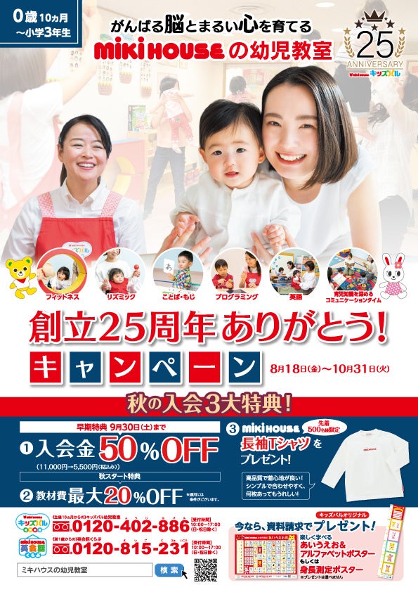 ミキハウスの幼児教室キッズパル「創立25周年記念ありがとう!キャンペーン」で先着500名様に「ミキハウスの長袖Tシャツ」をプレゼント! 秋の「学び」をサポートします!
