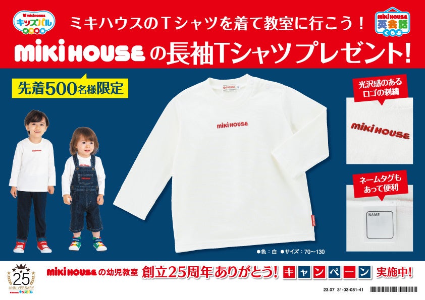 株式会社ミキハウスアンド小学館プロダクション(本社:東京都千代田区、代表取締役社長:喜田 力)が運営する0歳10ヵ月からのミキハウスの幼児教室「キッズパル」は今年創立25周年です。全国の百貨店で展開中の幼児教室「ミキハウス キッズパル」では、本日2023年8月18日(金)より10月31日(火)まで「創立25周年ありがとう!キャンペーン」を実施。期間中にご入会いただいた方先着500名様に、高品質で着心地が良い「ミキハウスの長袖Tシャツ」をプレゼントいたします。
