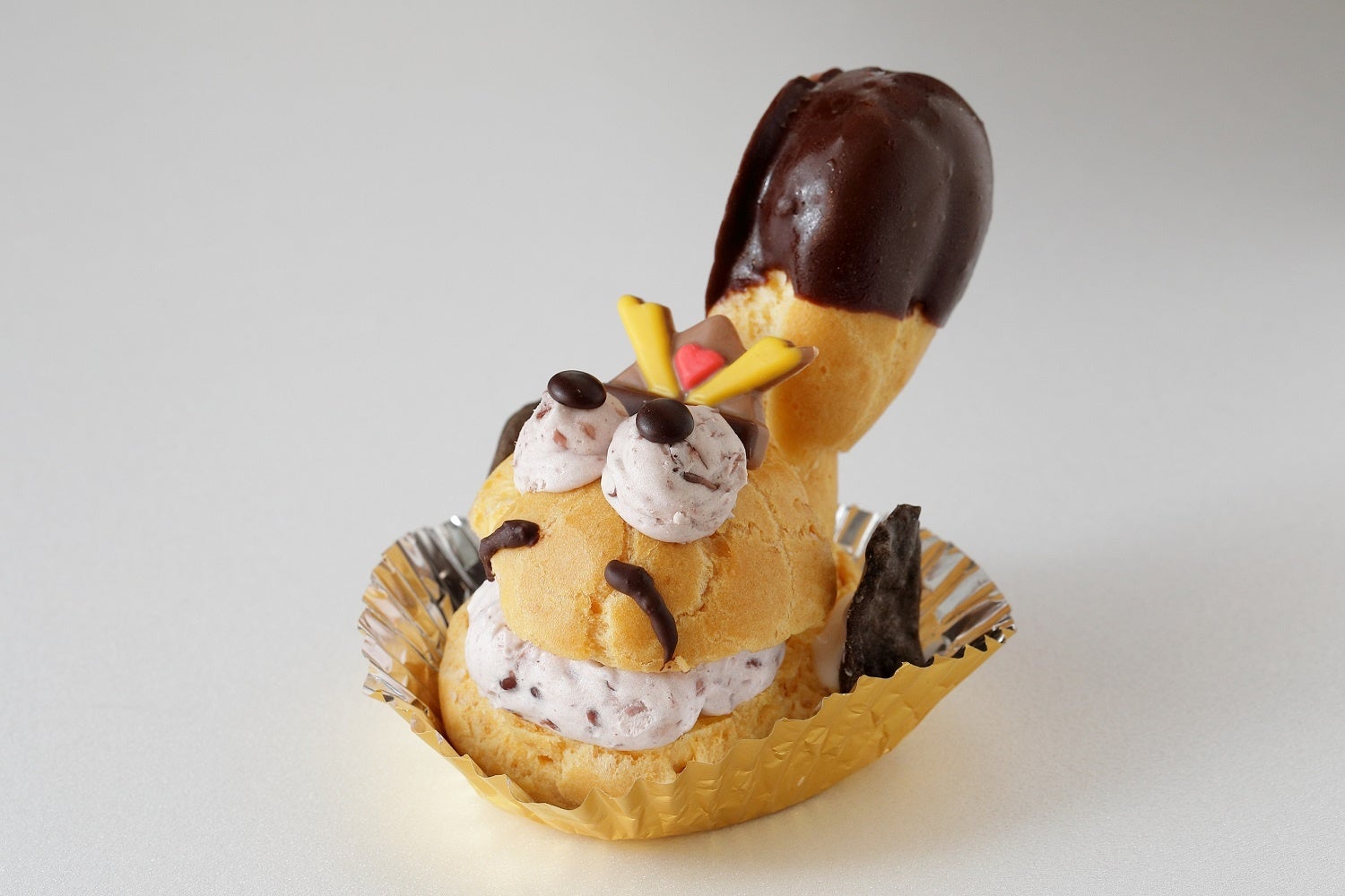 金シャチの形を模したシュークリーム、シャチボンが家康に変身。尾びれをちょんまげ風にし、味は名古屋らしく小倉クリームを使用しました。
